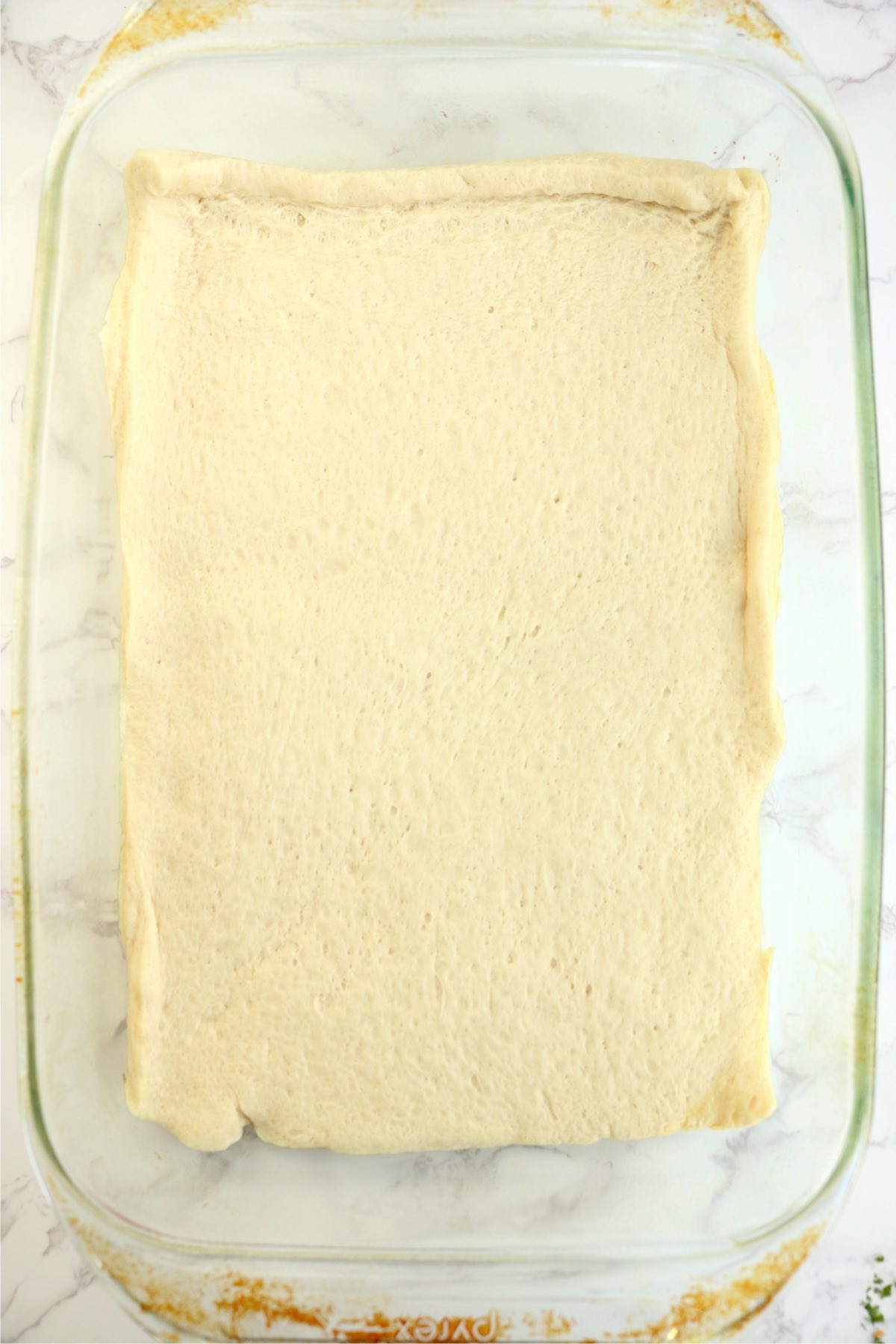 - Lay pizza dough in pan, stretching it to fit the bottom.