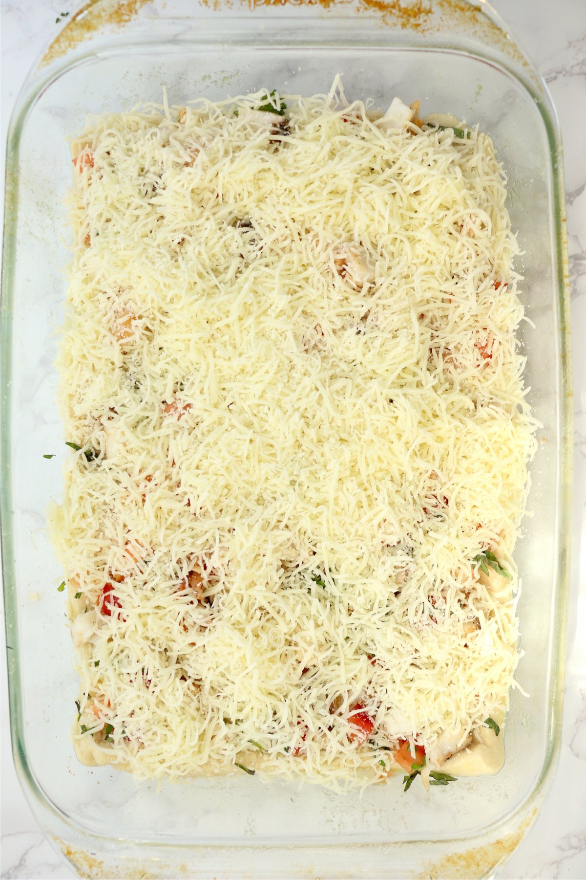 - Sprinkle tomatoes evenly over Parmesan cheese.