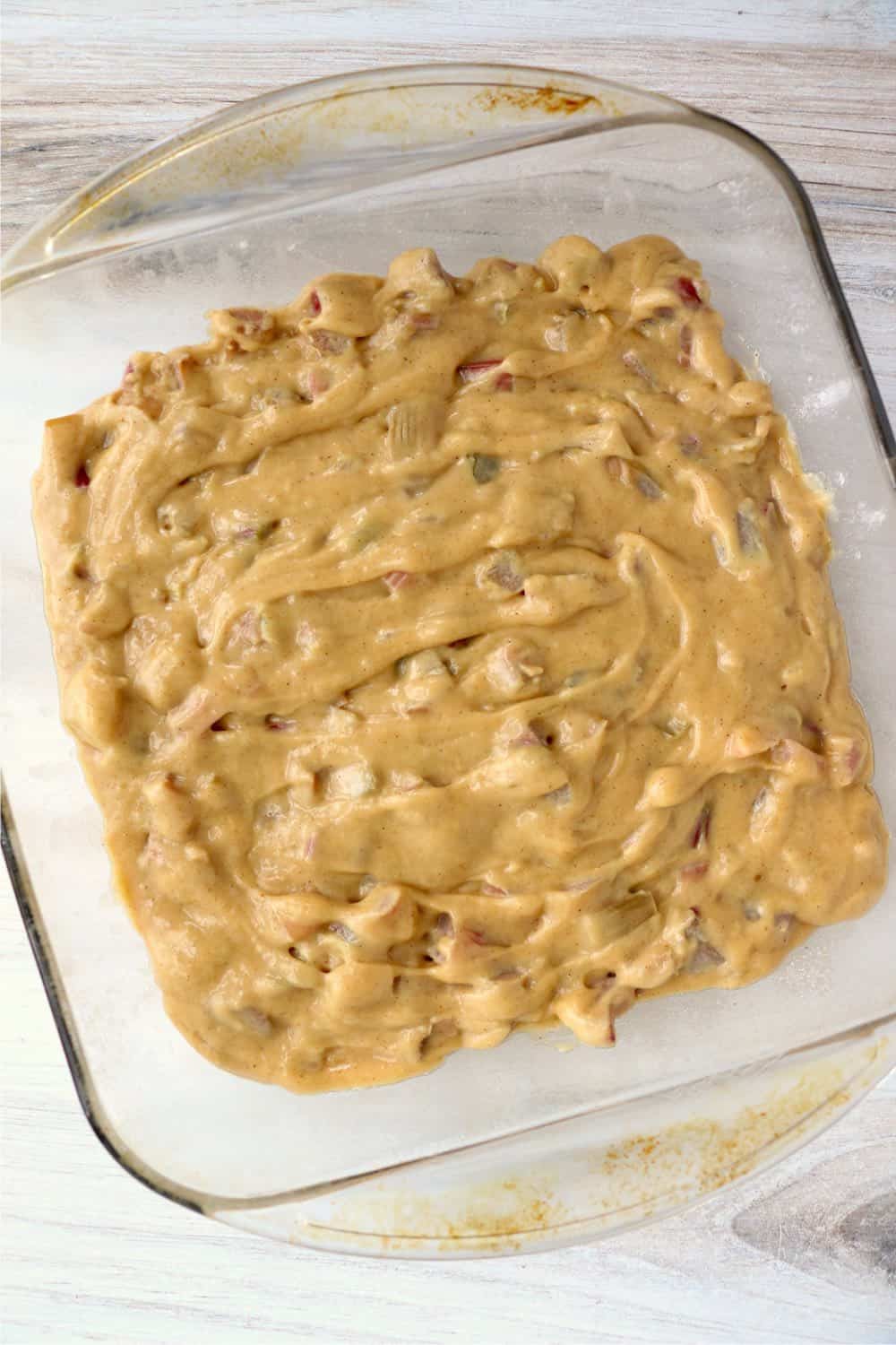 Stir rhubarb into batter. Pour batter into the prepared baking dish.