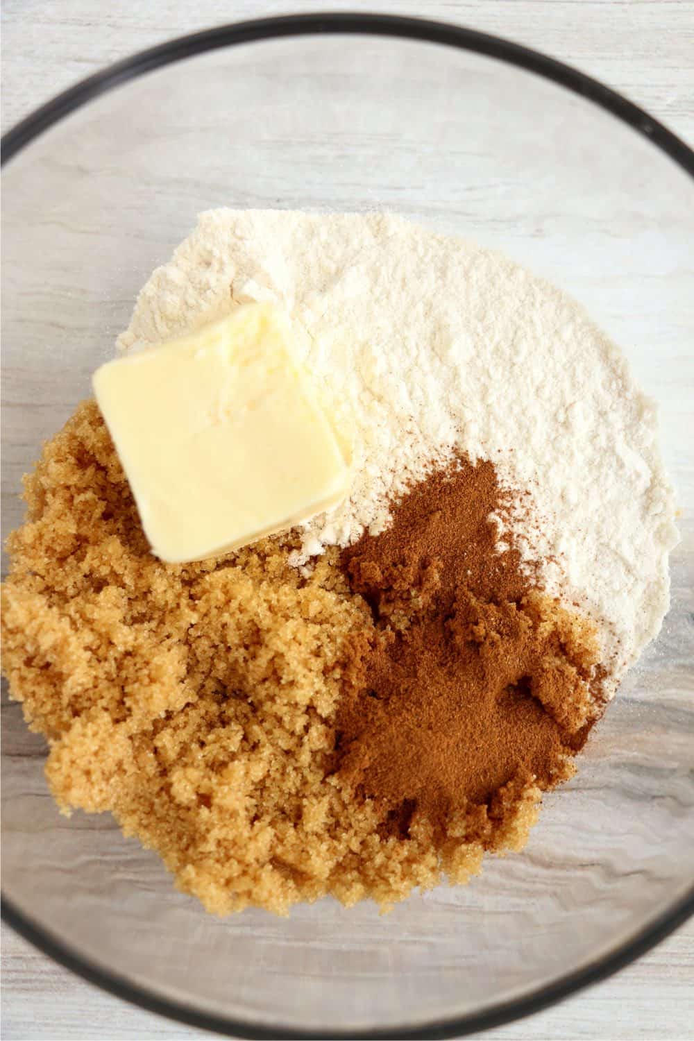 Step 6. In a small bowl, prepare the topping by mixing 1/4 cup brown sugar, 1/4 cup flour, 2 tablespoons butter, and 1/2 teaspoon cinnamon together. Use a fork. Topping will be crumbly.