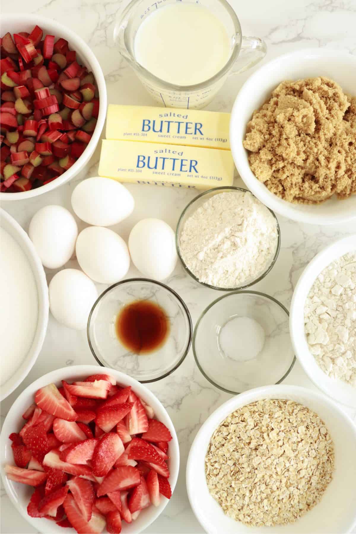 You'll only need a few basic ingredients to make this recipe. Outside of the rhubarb, everything you need is probably in your kitchen right now. Be sure to check the recipe card at the end of the post for exact amounts.