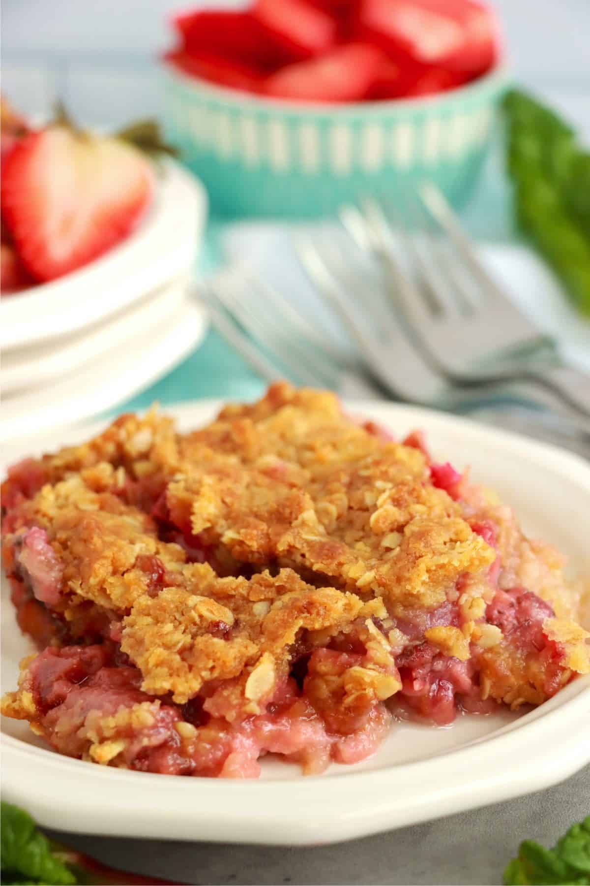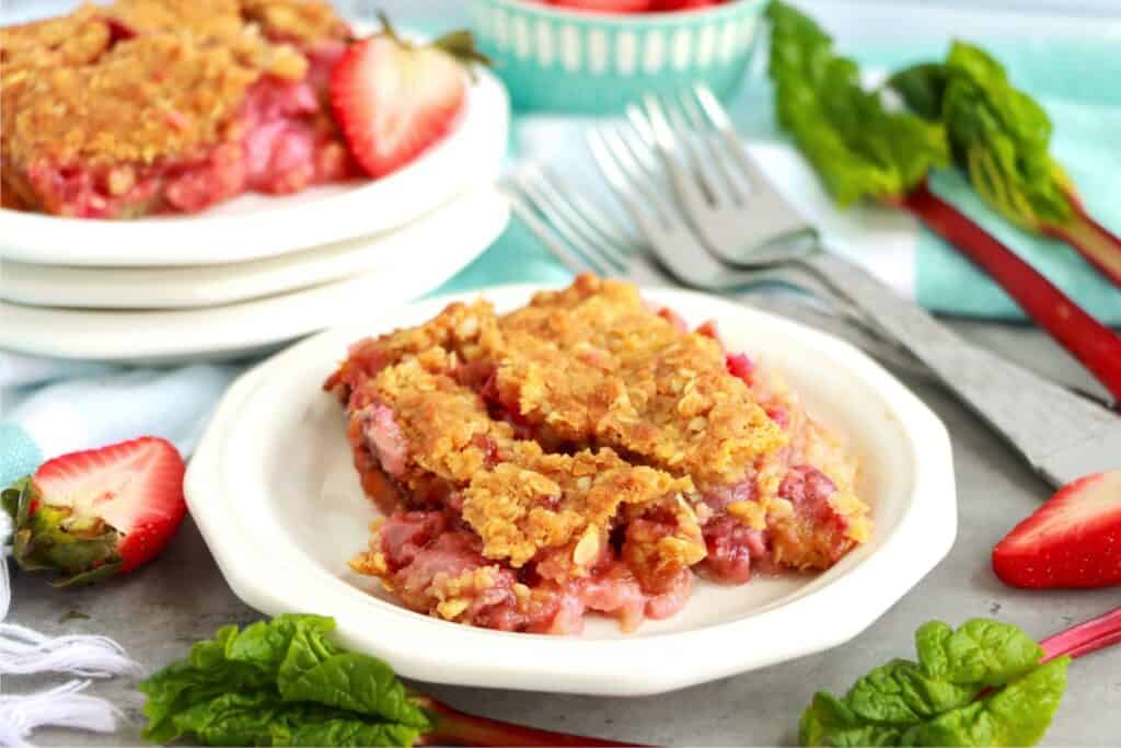 If you love rhubarb desserts, then you're in for a big, big treat. These delicious bars are one part dessert bar, one part crumble dessert, and all delicious. It's an easy recipe that delivers an explosion of flavor in every bite.