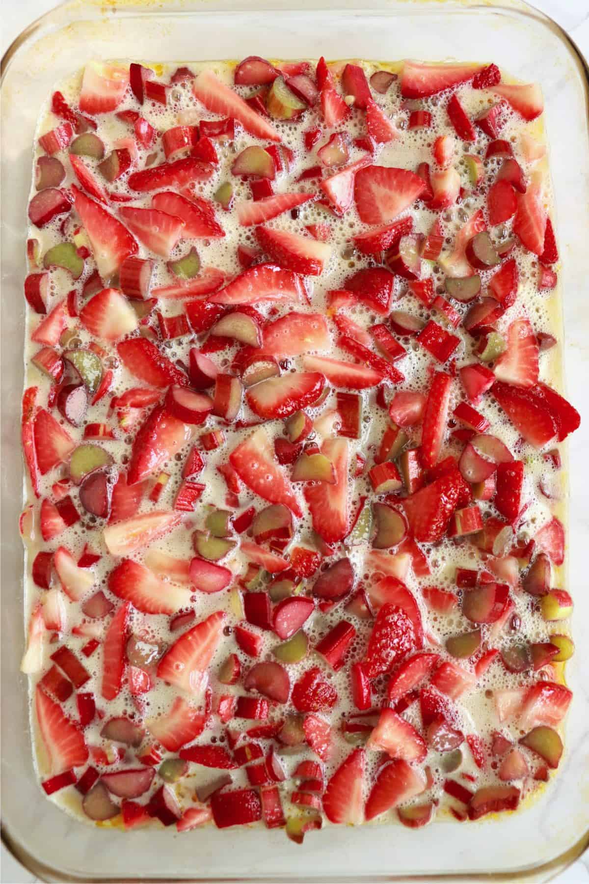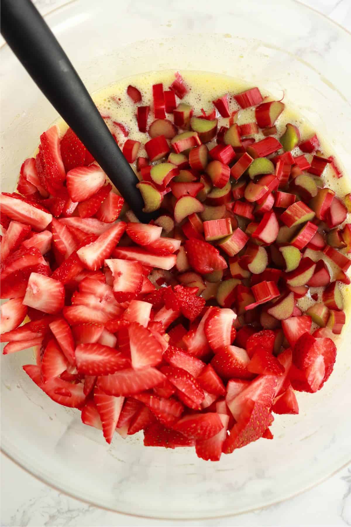 - Cut your rhubarb into small, bite-size pieces so they get nice and soft while baking.