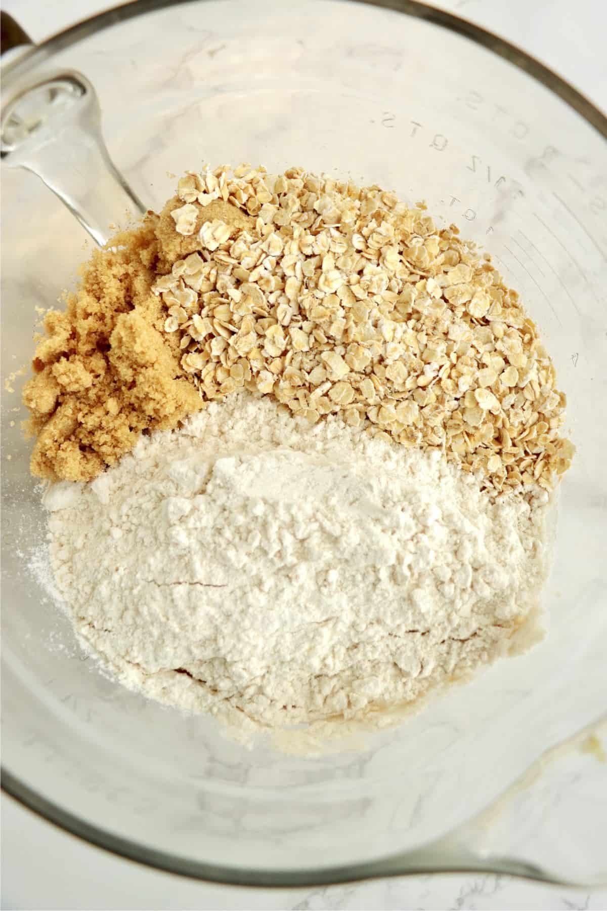 - Prepare topping by combining butter, flour, brown sugar, and oatmeal.