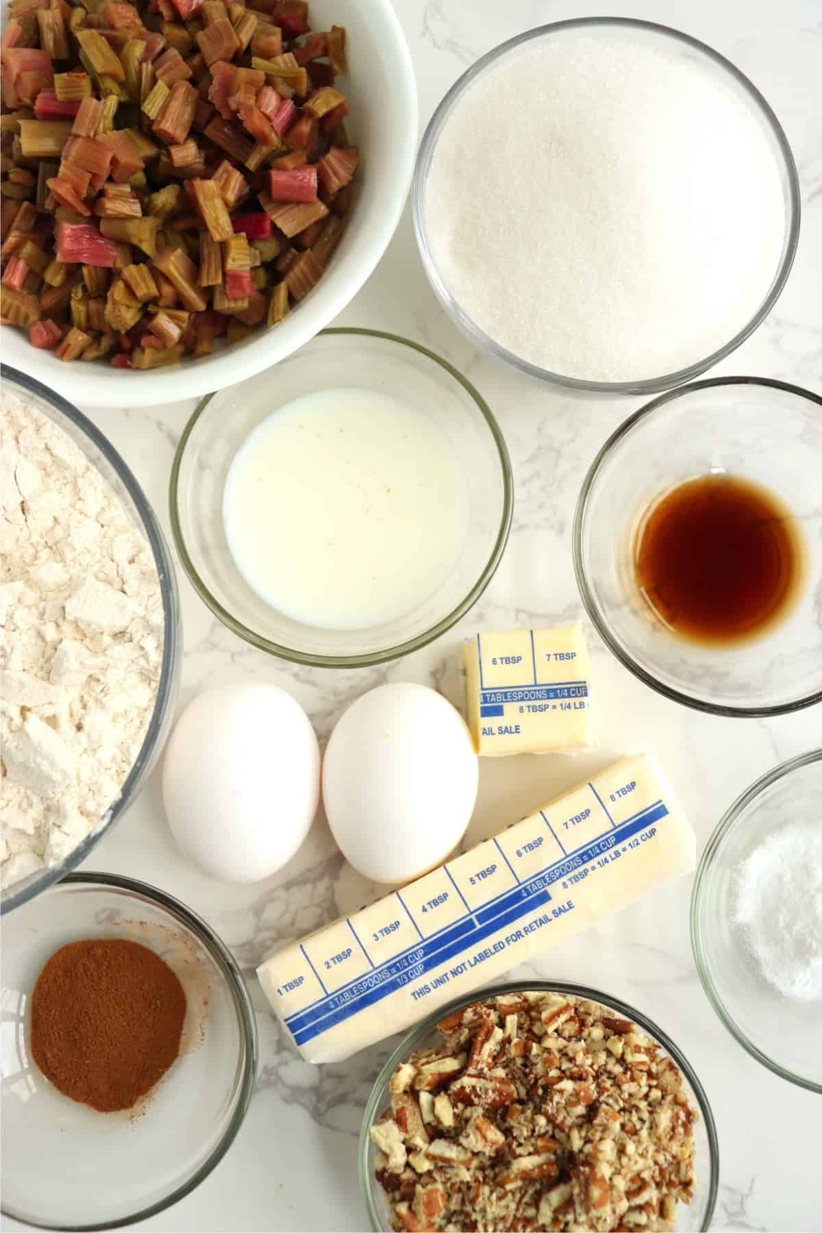 You'll only need a few basic baking ingredients to make this recipe. Outside of the rhubarb, you probably have everything you need in your kitchen right now. The Be sure to check out the recipe card at the end of the post for the exact amounts.