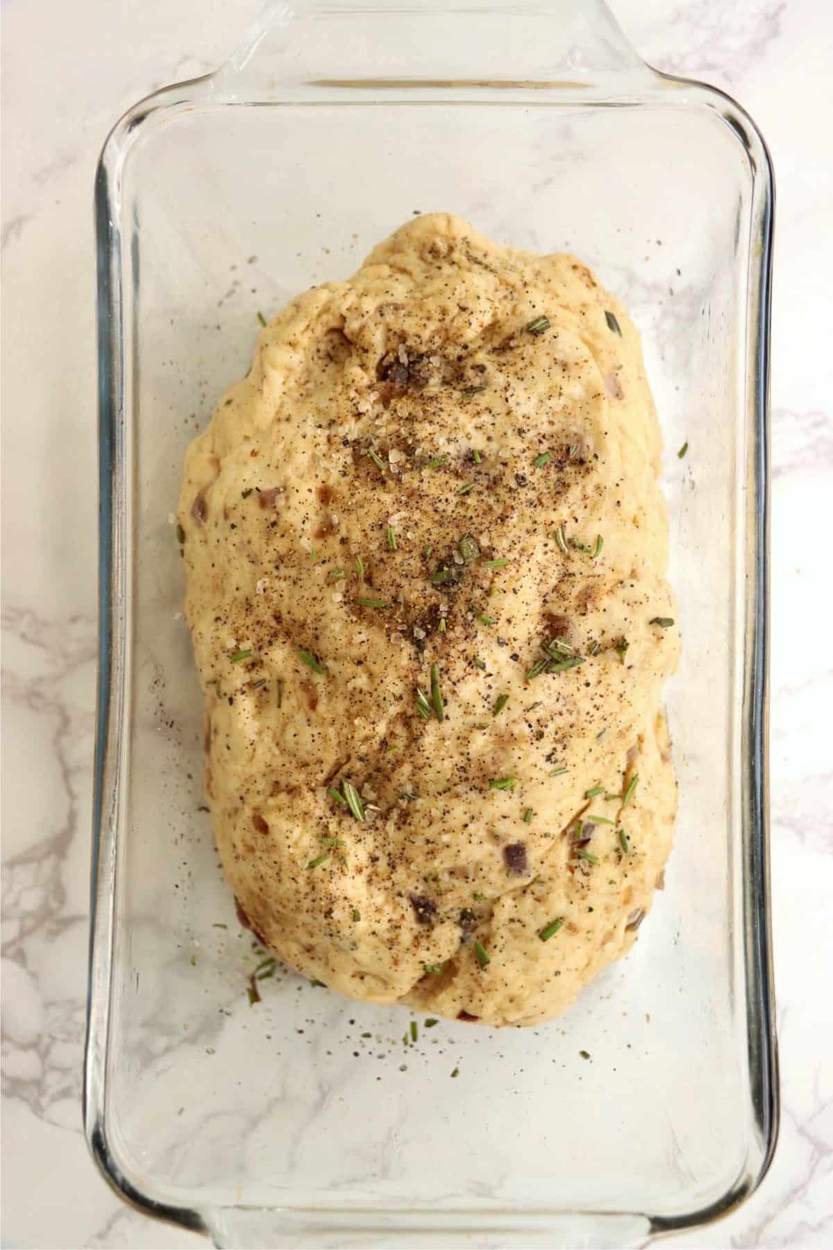 7: Add the dough to 2 loaf pans and top with the herb mixture.