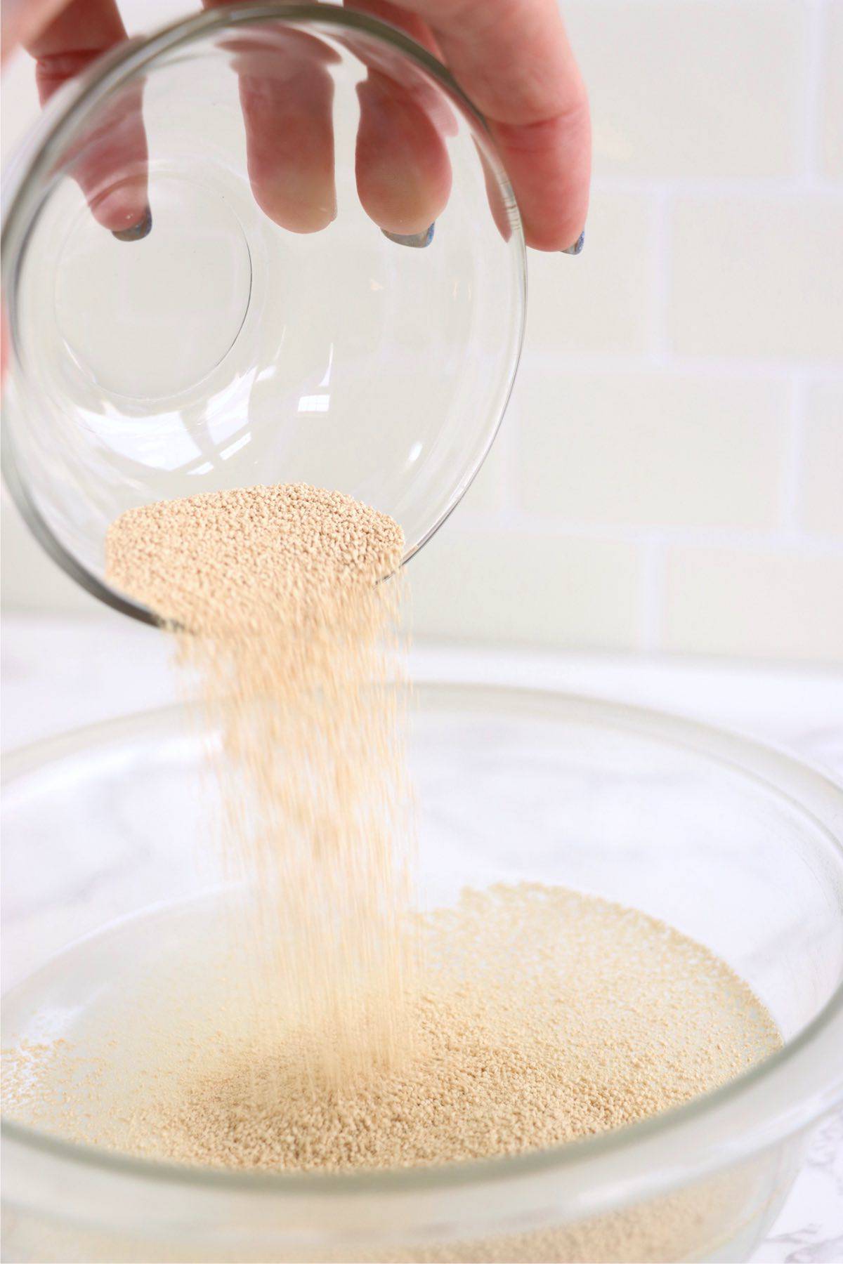 - Using a small bowl, combine yeast, sugar, and warm water. Stir until dissolved. Let sit for 10 to 15 minutes, until frothy.