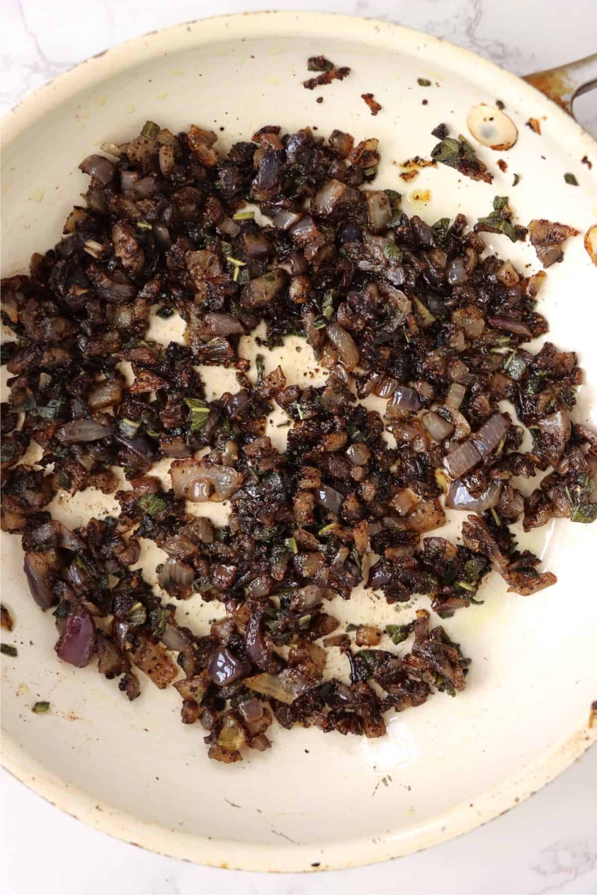 - Add finely chopped onions, sage, and pepper. Stir regularly until onions are tender. Set aside and allow to cool.