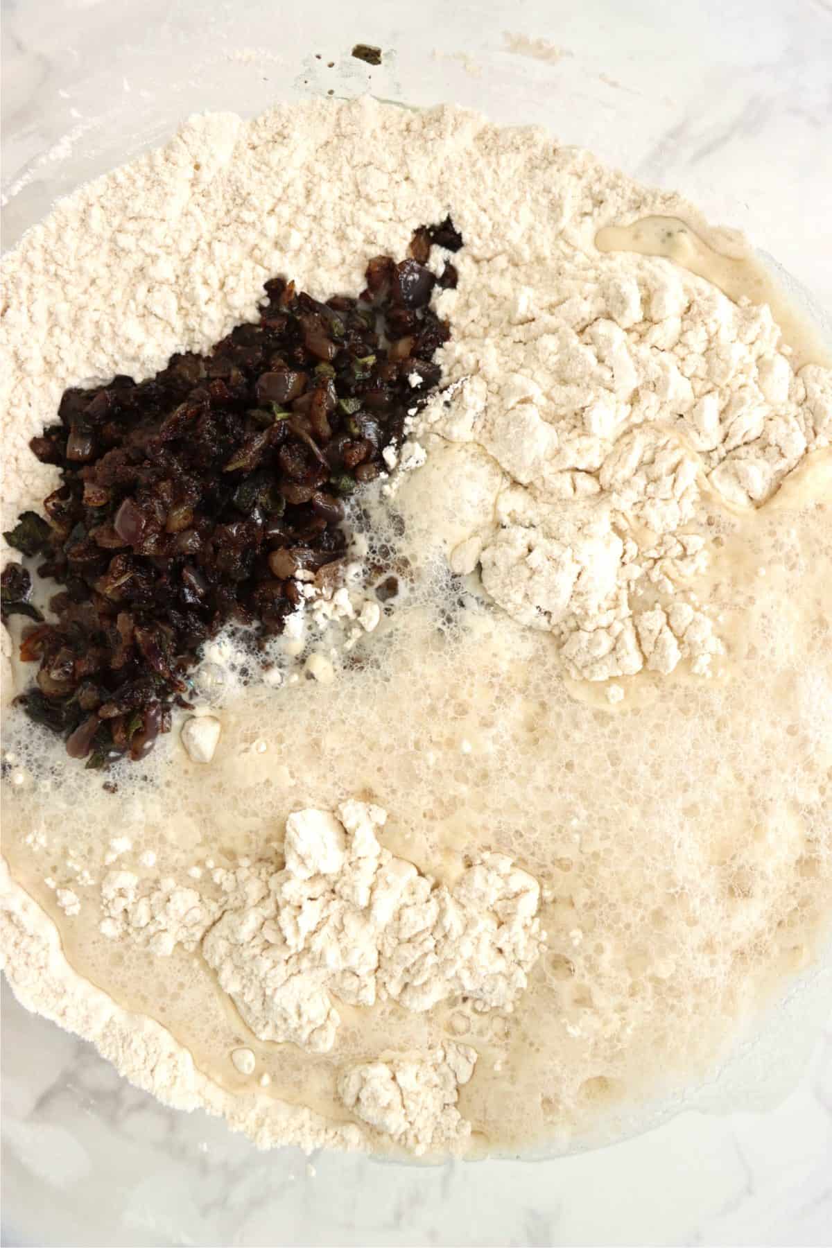 3: Add olive oil and mix well, then add onions and dry bread ingredients and mix again.