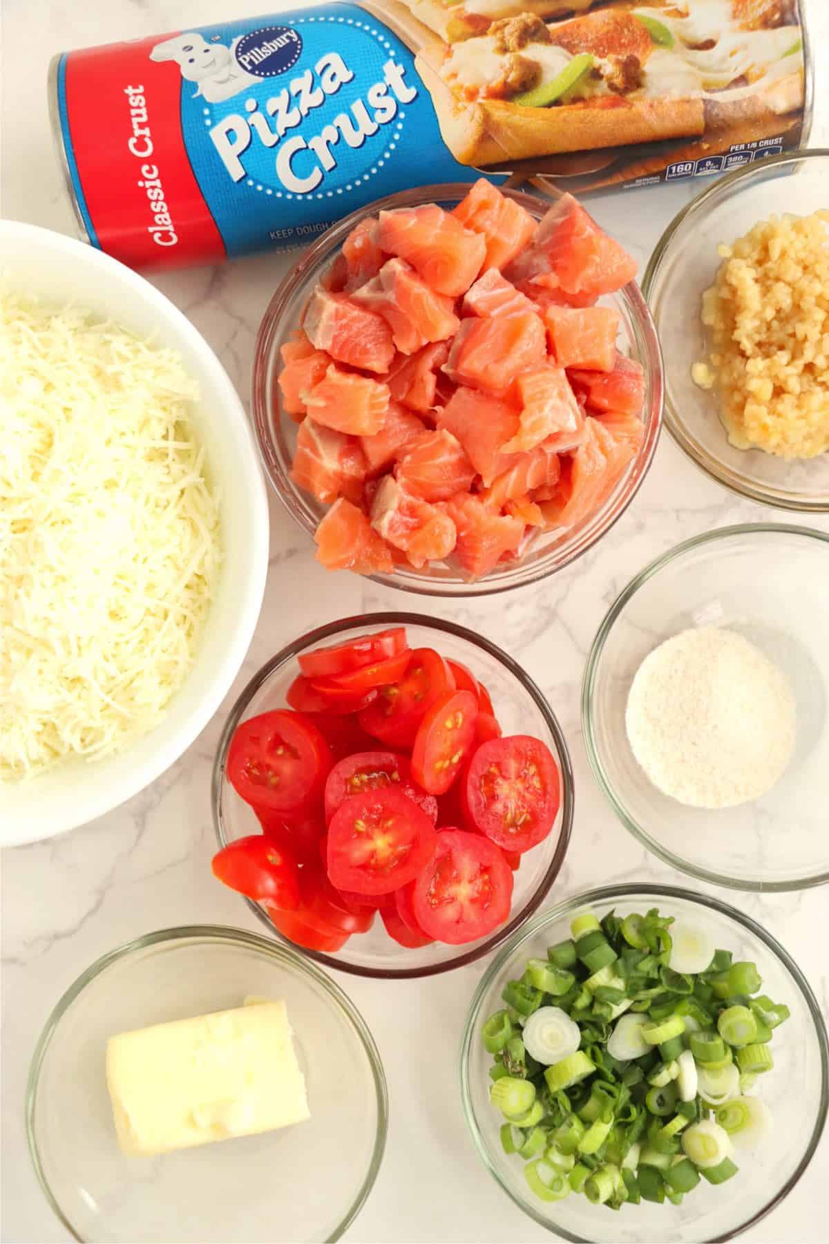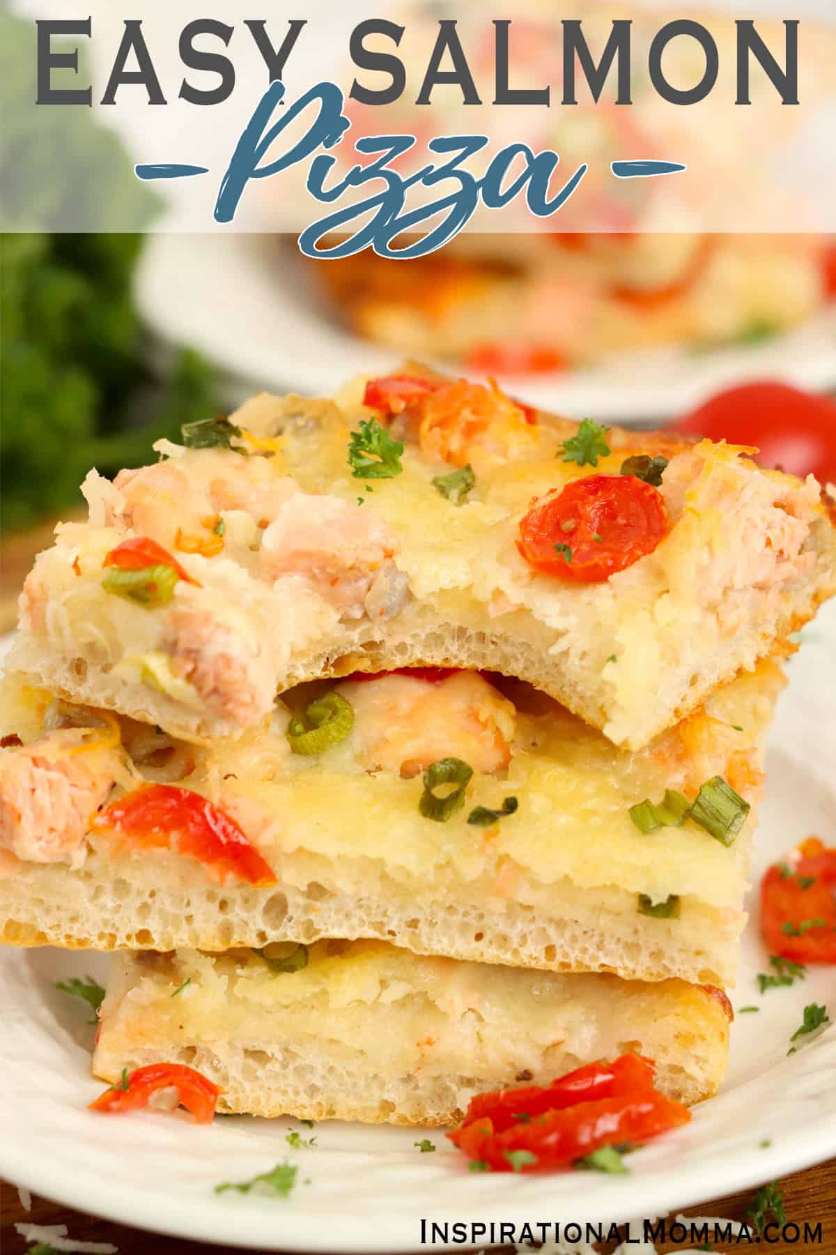Salmon pizza is a healthy seafood pizza made with a pre-made pizza crust, salmon chunks, tomatoes, mozzarella cheese, and green onions.