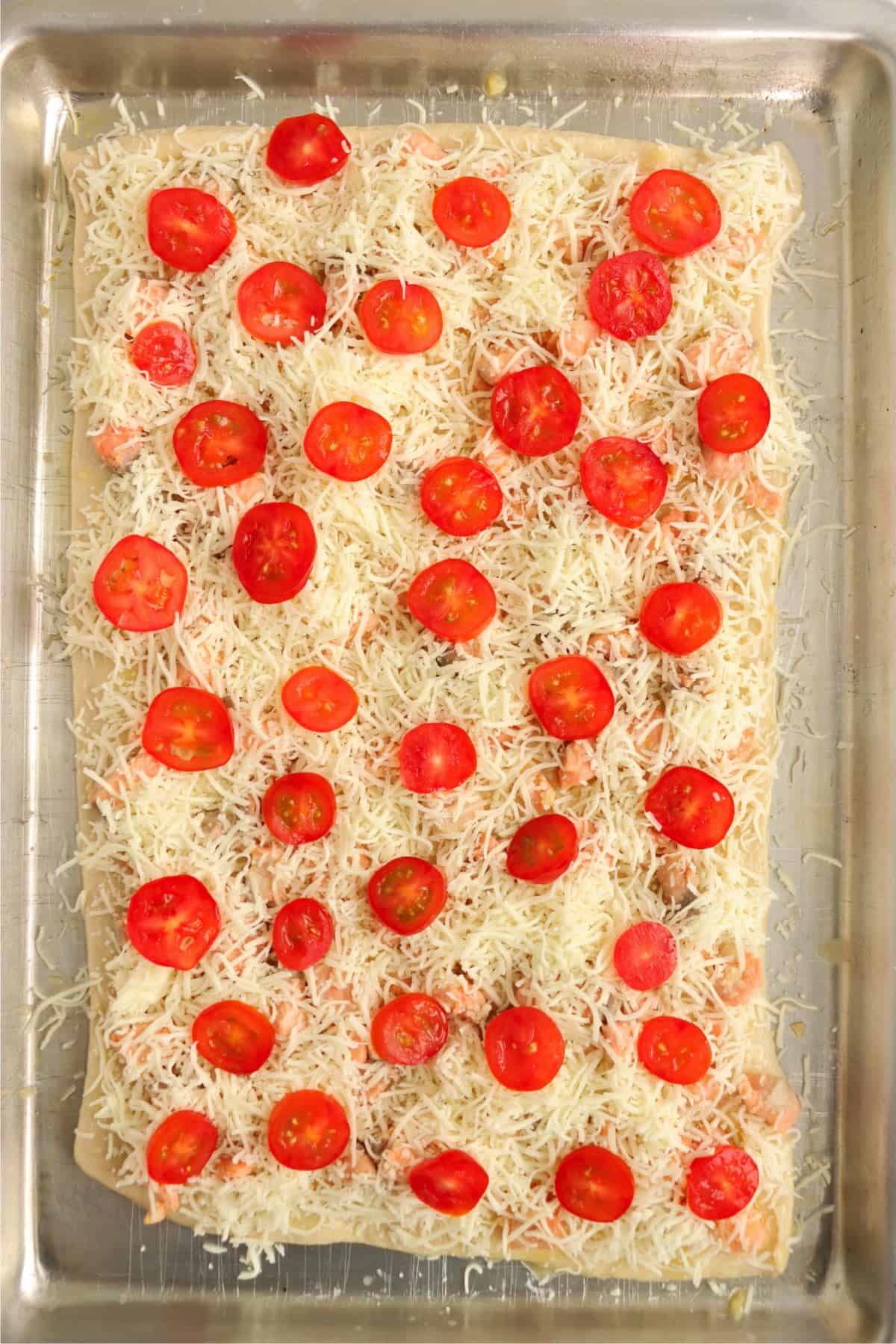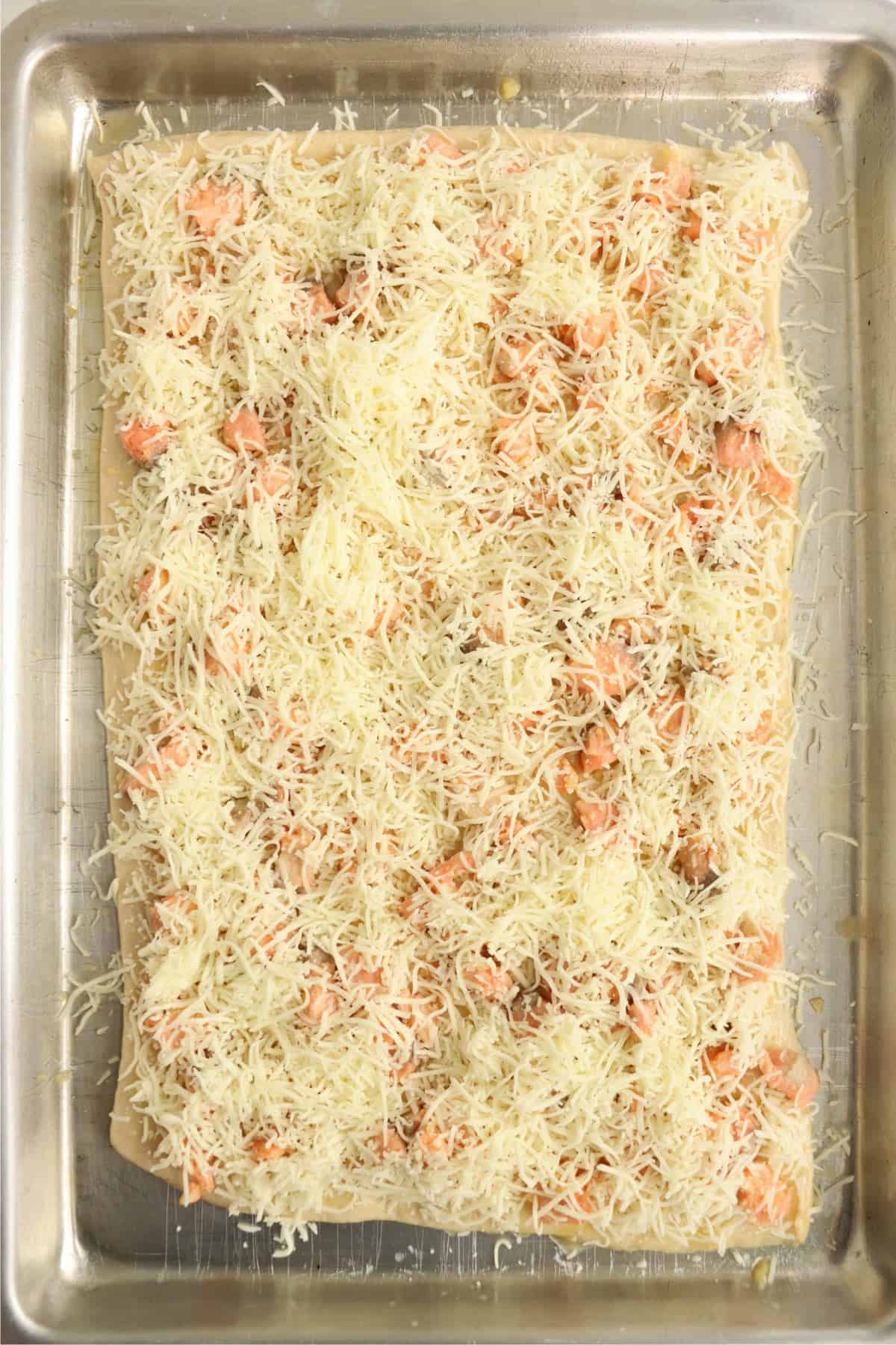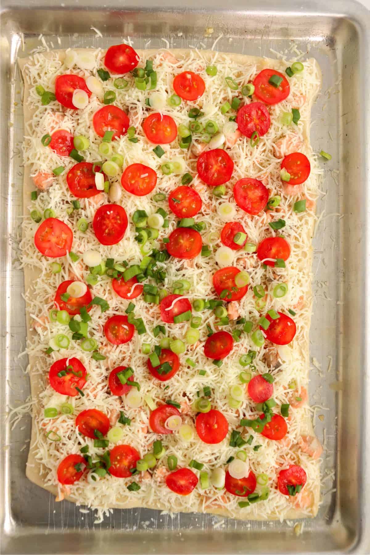 4: Evenly spread salmon, cheese, tomatoes, and green onion over the crust.