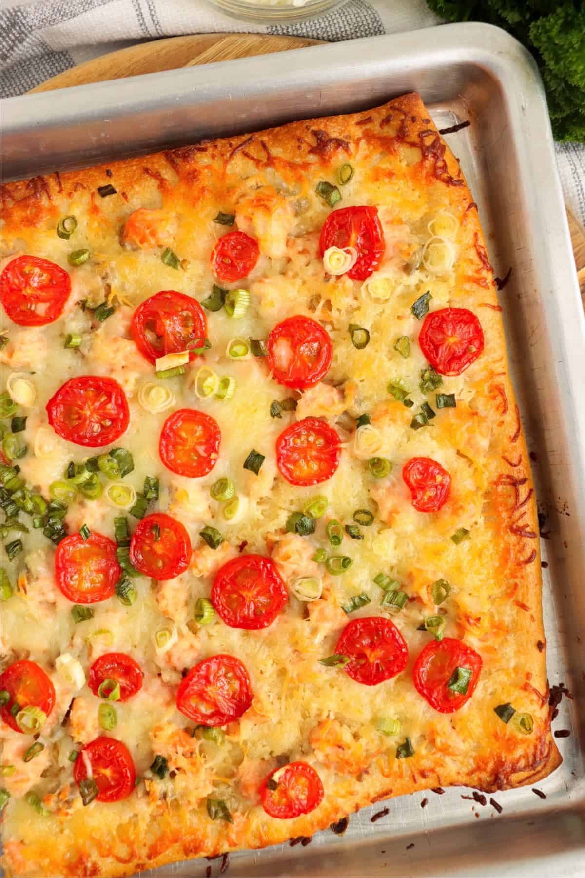 Salmon pizza is a sheet pan pizza topped with salmon, seasonings, mozzarella cheese, cherry tomatoes, and green onions for a healthy meal.