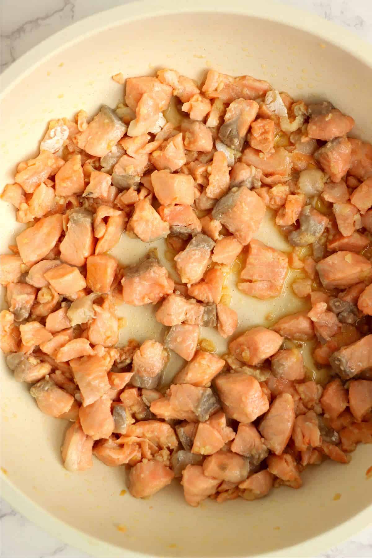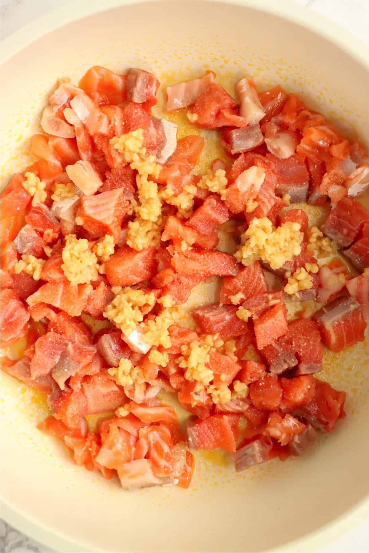 - In a medium skillet sprayed with non-stick cooking spray, add salmon, 1 tbsp minced garlic, and 1 tsp garlic salt. Cook over medium heat for about 3 minutes or until salmon pieces are cooked through.