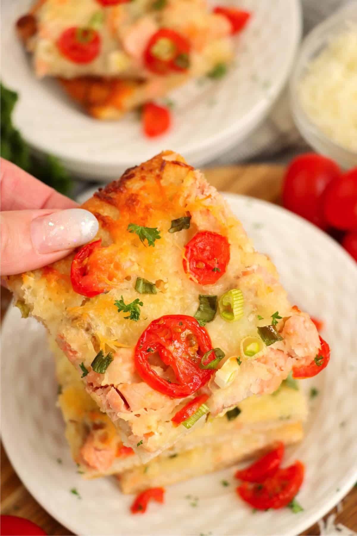 - The salmon, cheese, vegetables, and seasonings create delicious flavor in every bite.