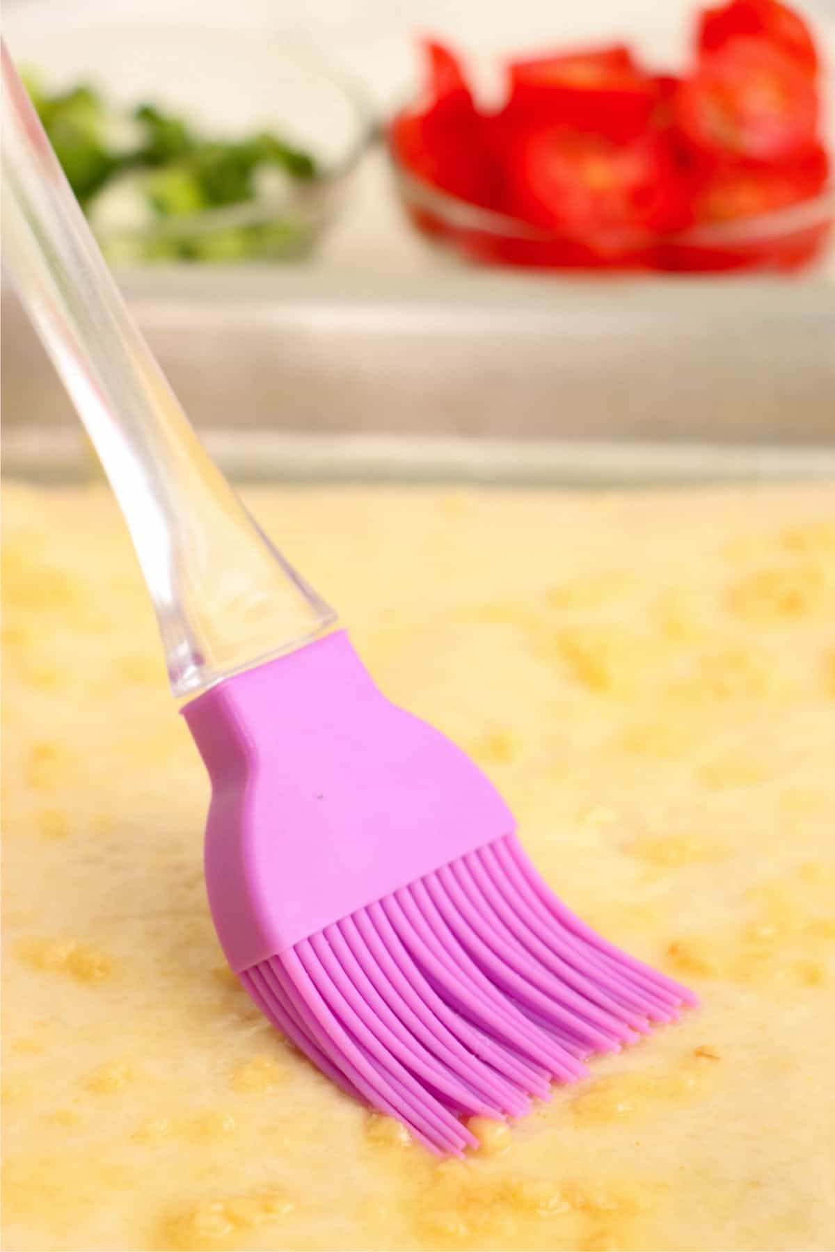 3: Melt the butter and mix in minced garlic and garlic salt. Then, brush the mixture over the crust.