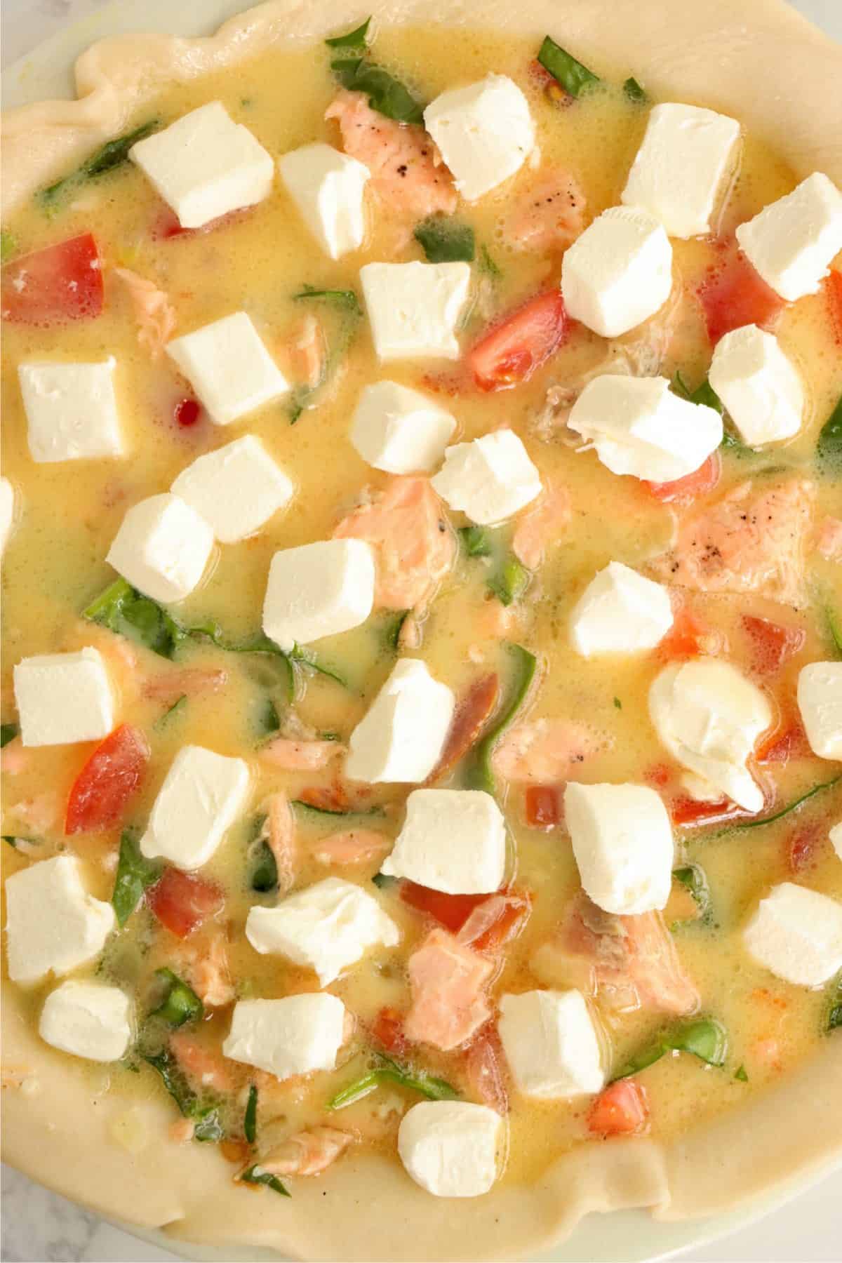 6: Cut the cream cheese into chunks and place them on top of the quiche.