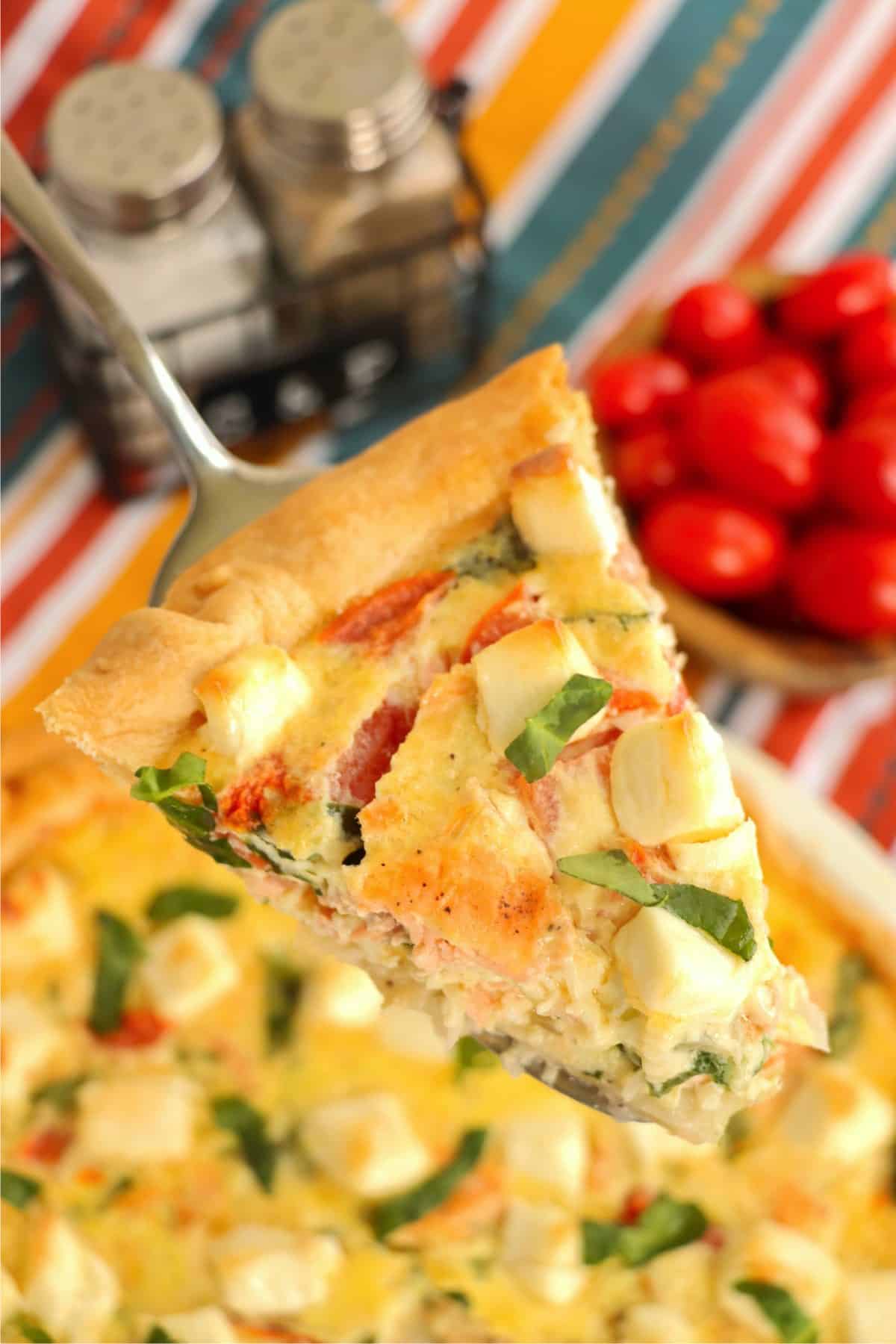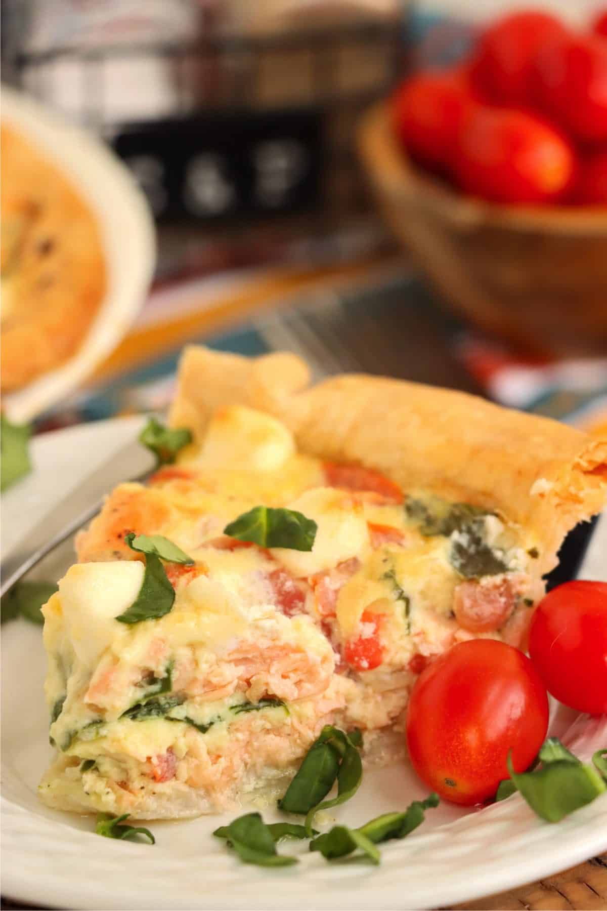 Spinach salmon quiche is hearty, healthy, and delicious. A flaky pie crust is loaded with tons of perfectly cooked eggs full of spinach and salmon for a breakfast that's as healthy as it is tasty.