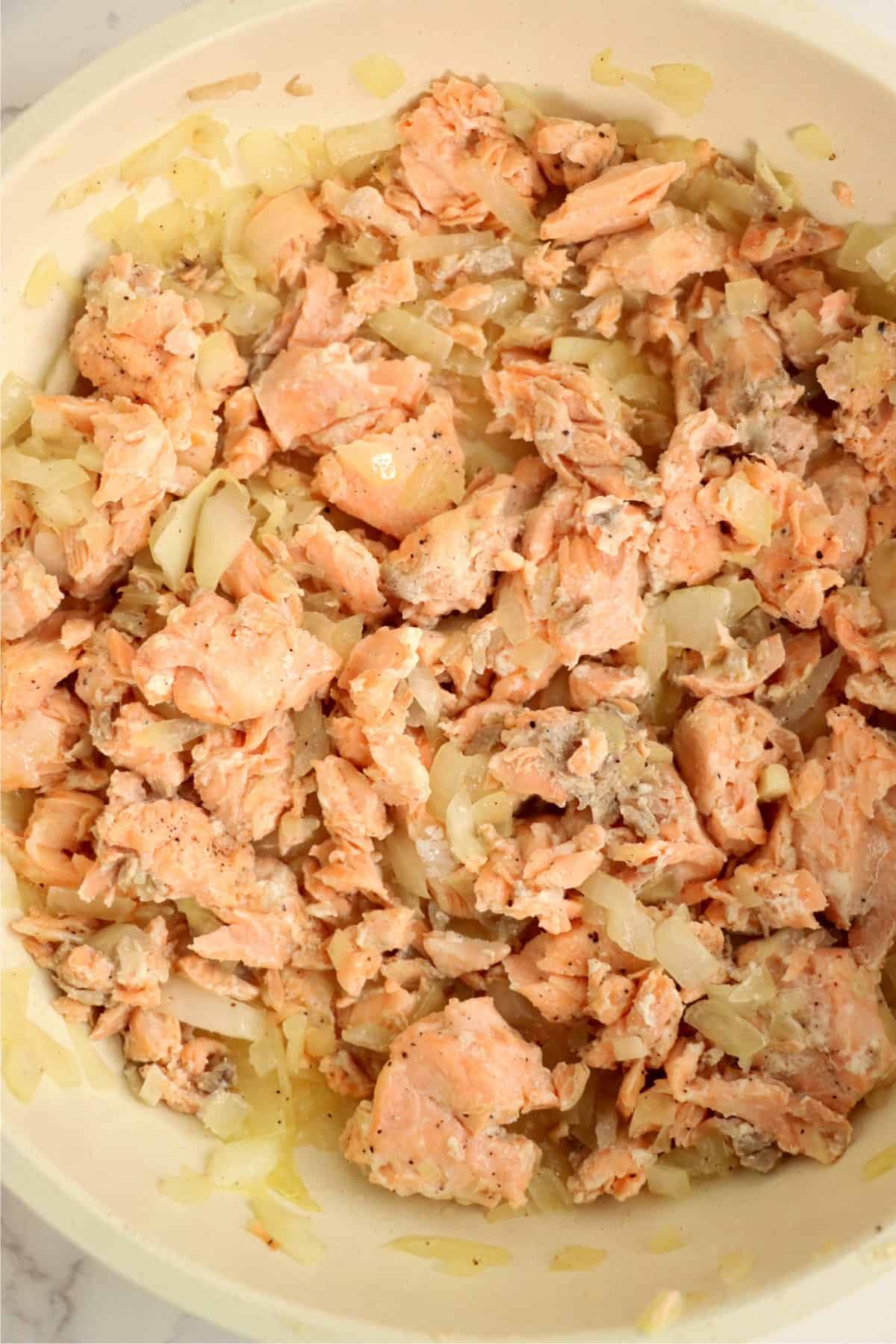 2: Cook the salmon and onions until the salmon is fully cooked. Break the salmon into chunks as it cooks.