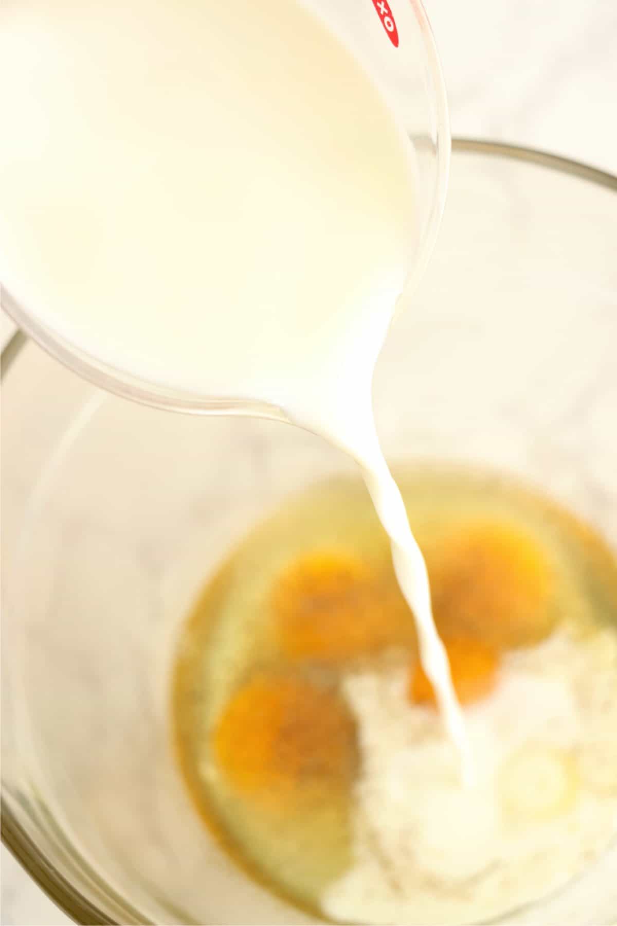 - In a large bowl, combine eggs, milk, salt, and pepper.