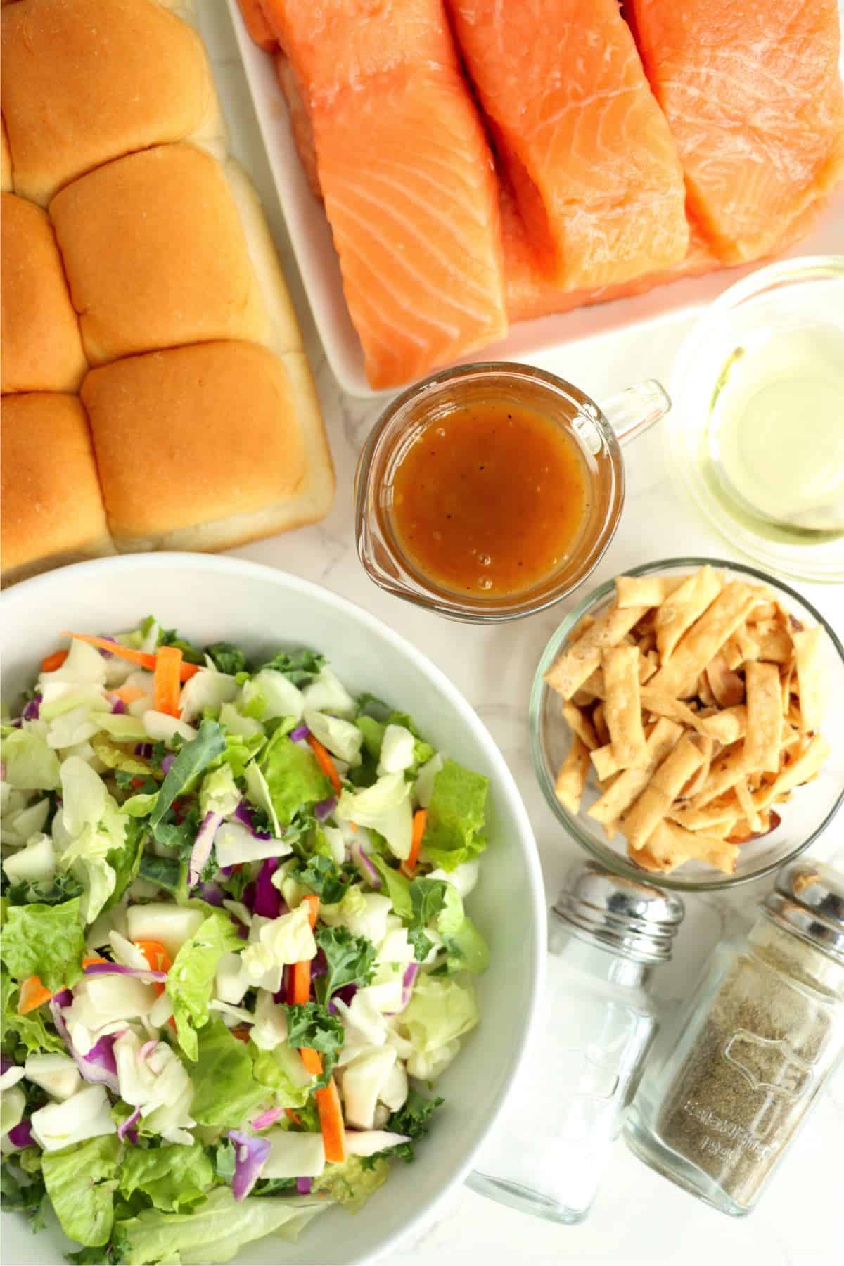 - Assemble sliders by placing cooked salmon, salad mix, sliced almonds, and wonton strips on Hawaiian rolls.