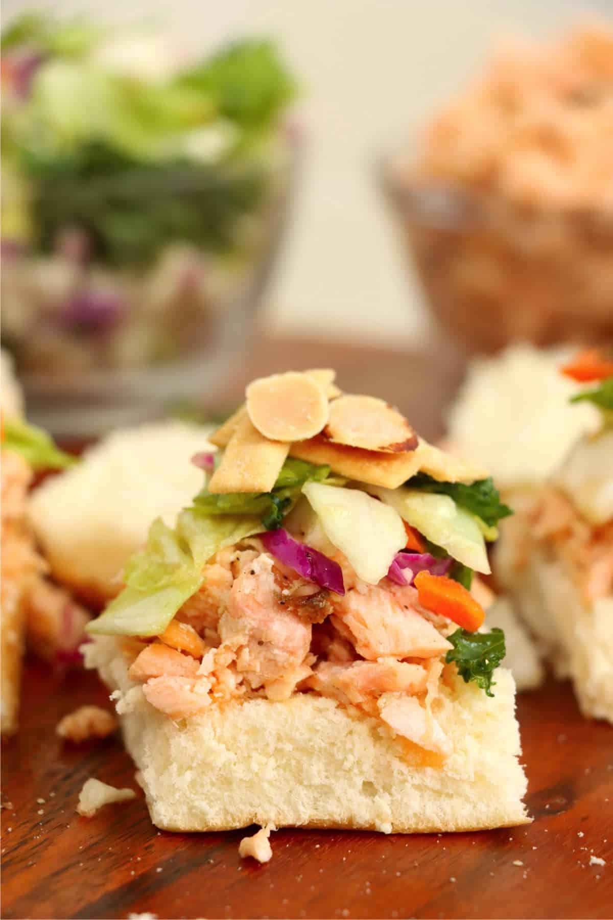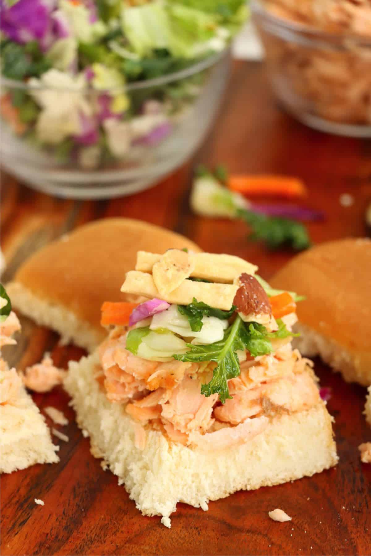 3: Add salmon, salad, wonton chips, and sliced almonds to Hawaiian rolls and enjoy!