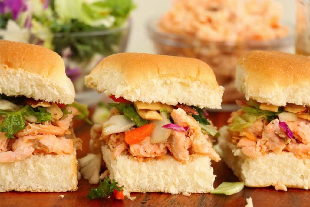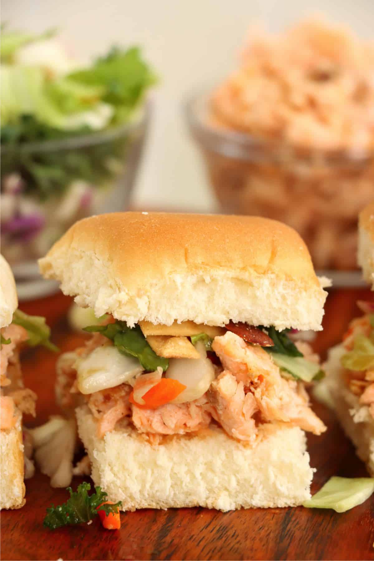 Salmon sliders are loaded with salmon and chopped Asian salad with dressing between two halves of soft Hawaiian rolls.