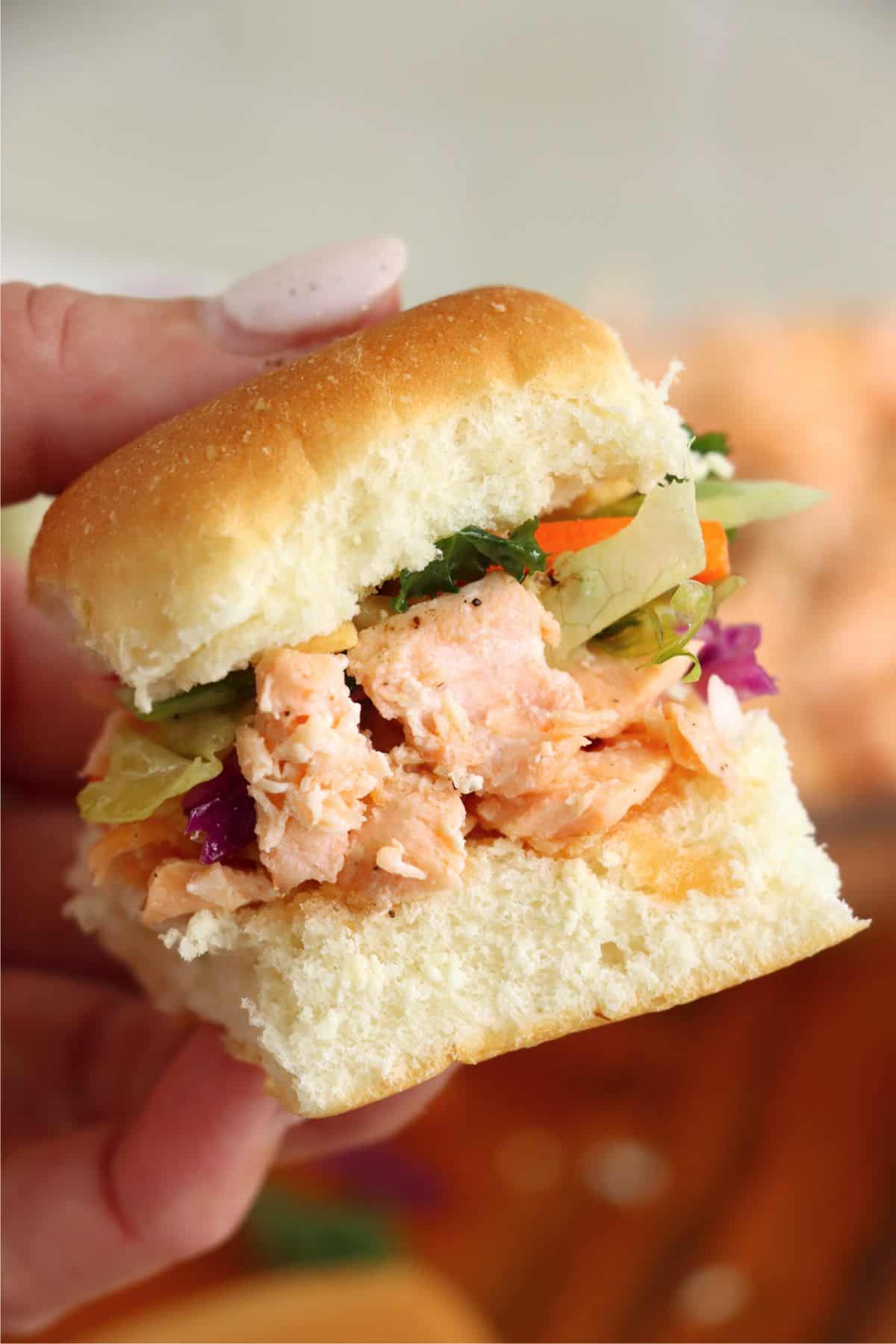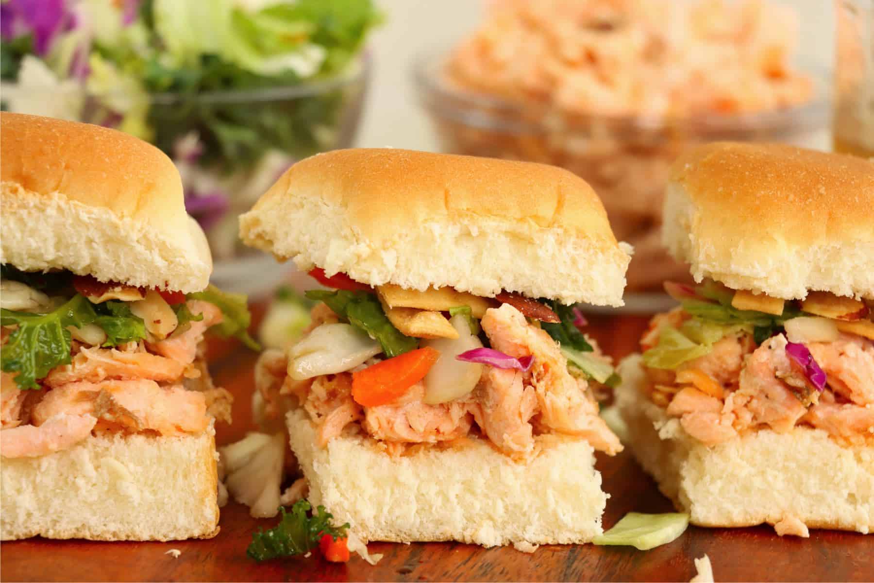 Reheat: Add the salmon to a skillet with a little water and heat over medium-low heat until warm. Then, construct the sliders.