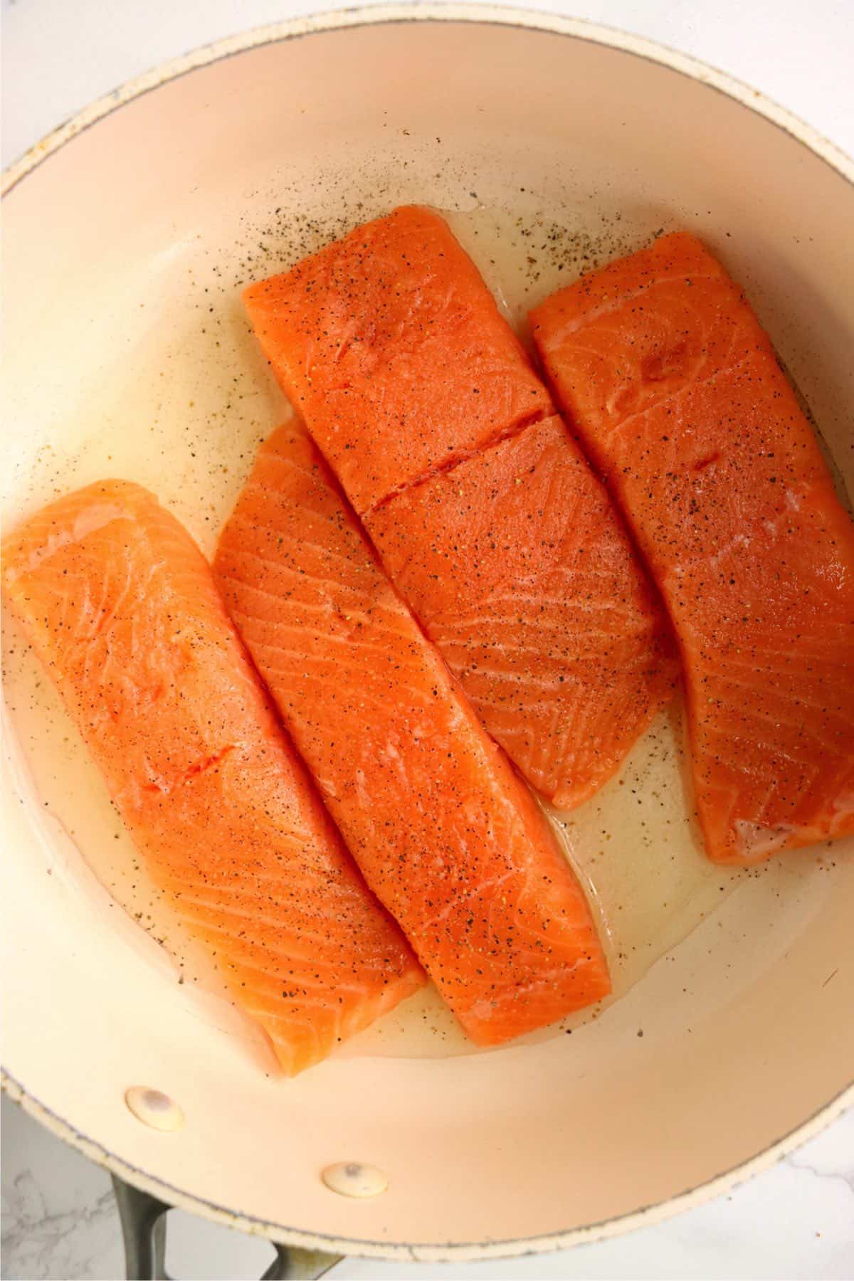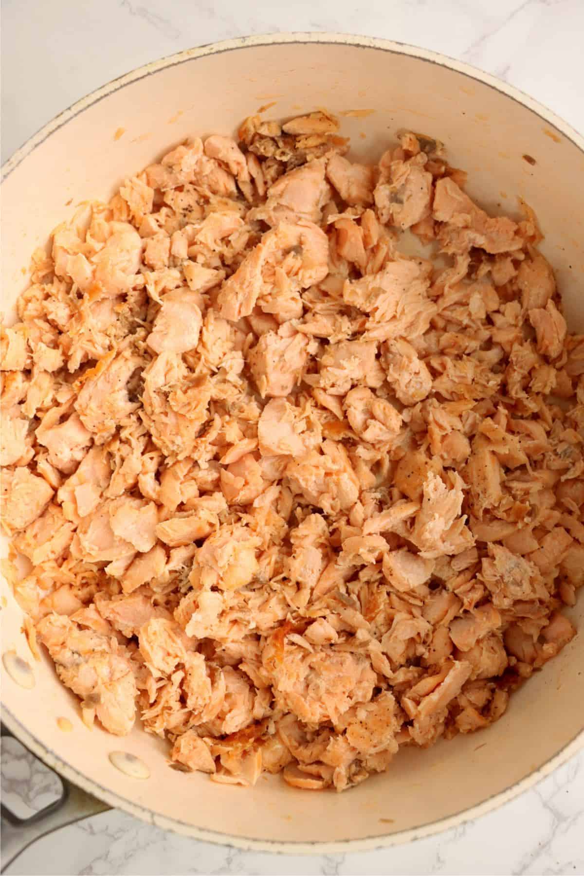 - Add salmon filets to heated skillet and season with salt and pepper. Cook for approximately 8 minutes. As salmon cooks, break it apart with a spatula. Set aside.