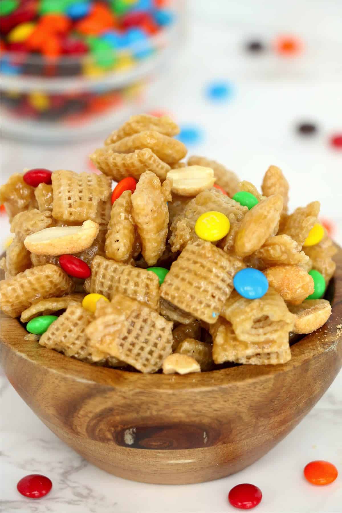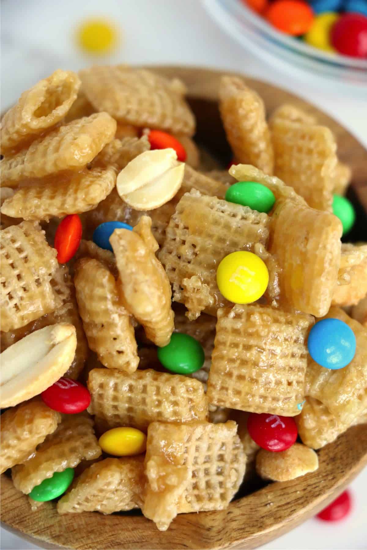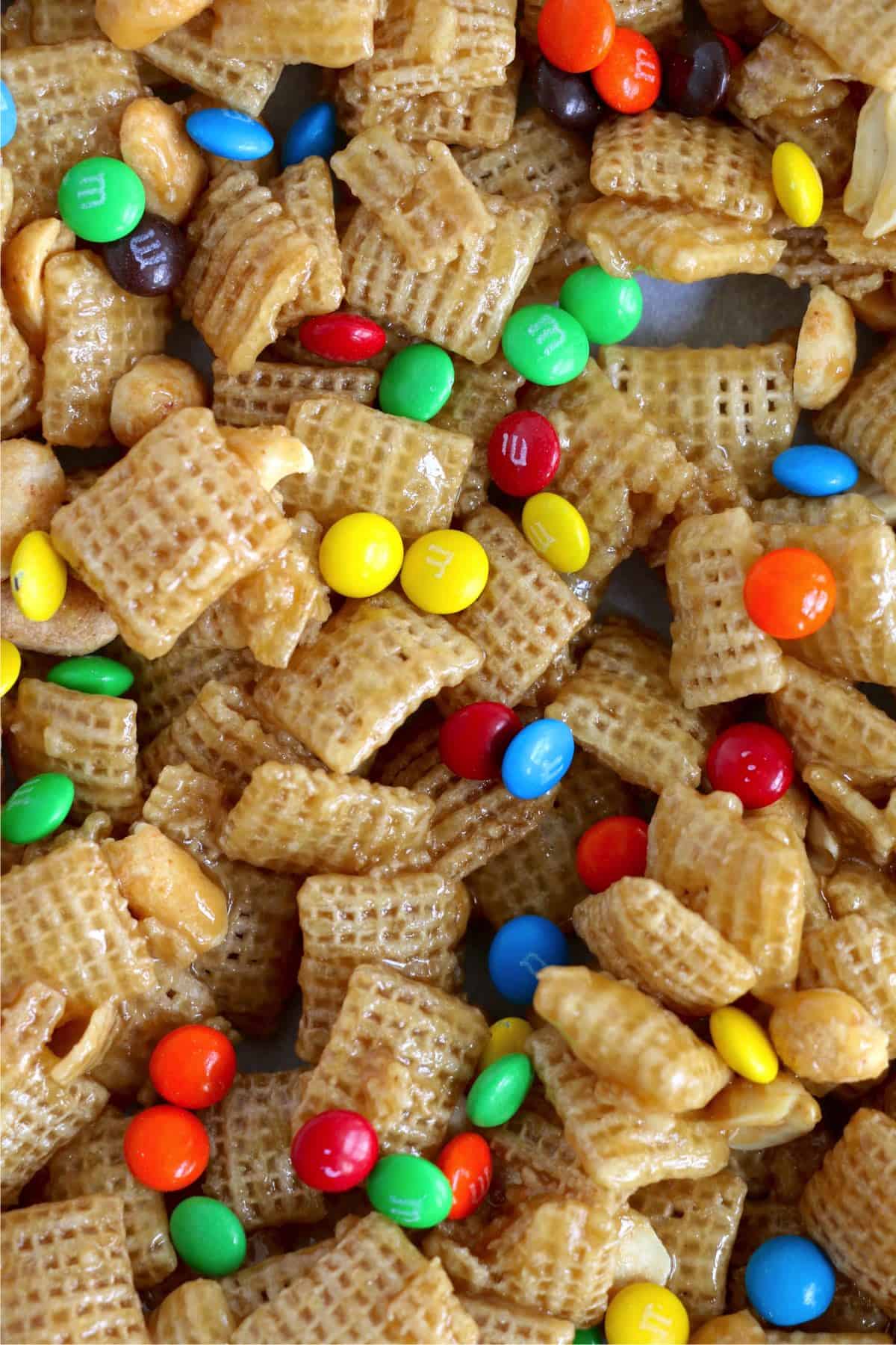 Crispy Chex cereal is coated with a delicious salty and sweet caramel coating and then mixed with candies, peanuts, and more. What could be better than that? Nothing, that's what.