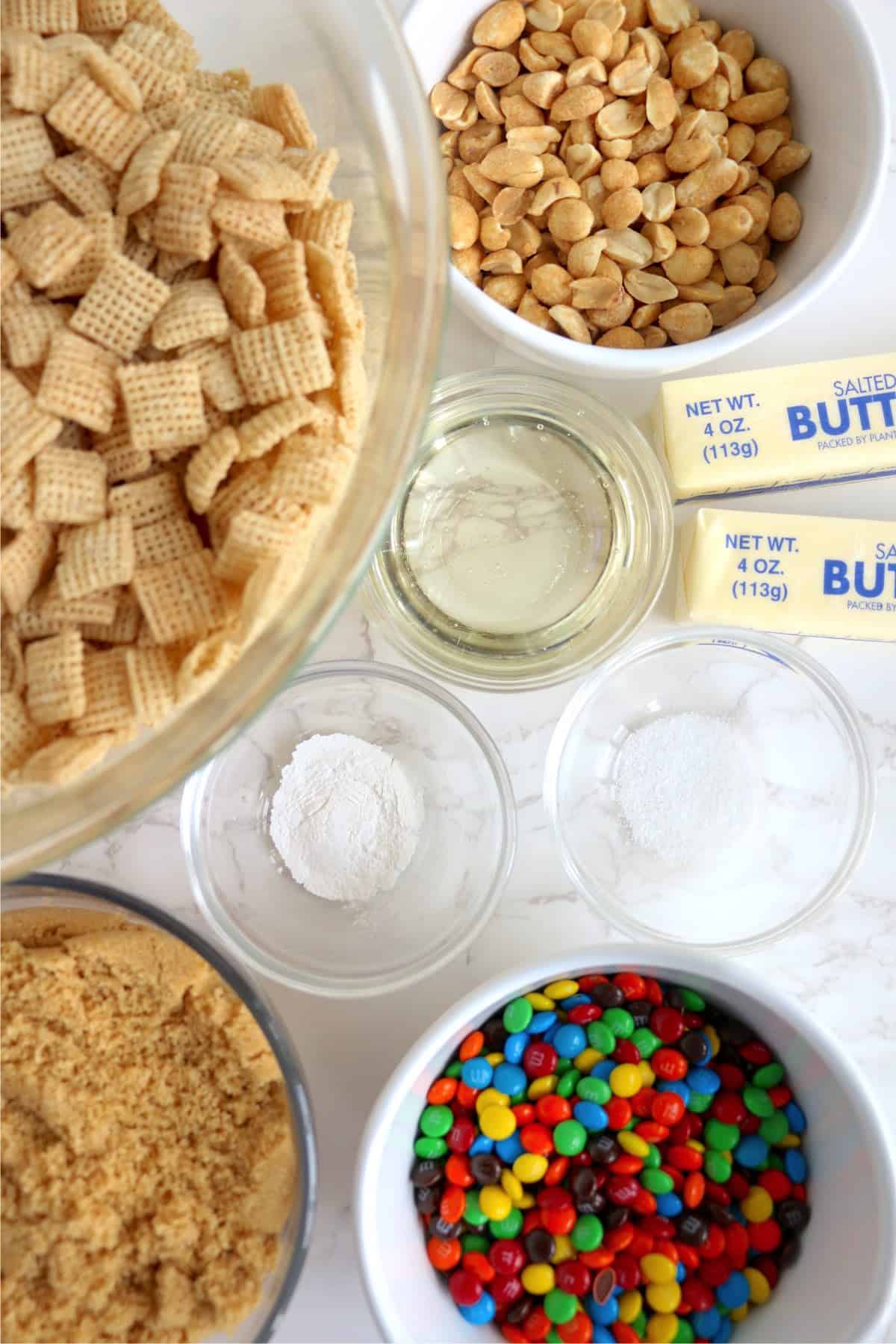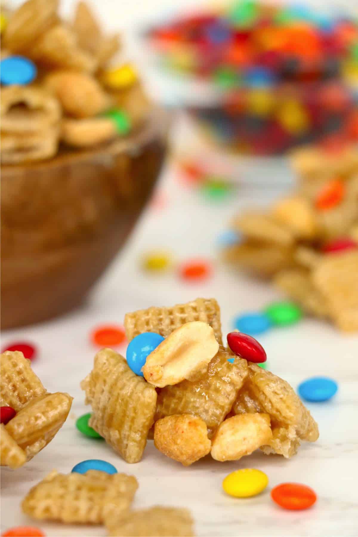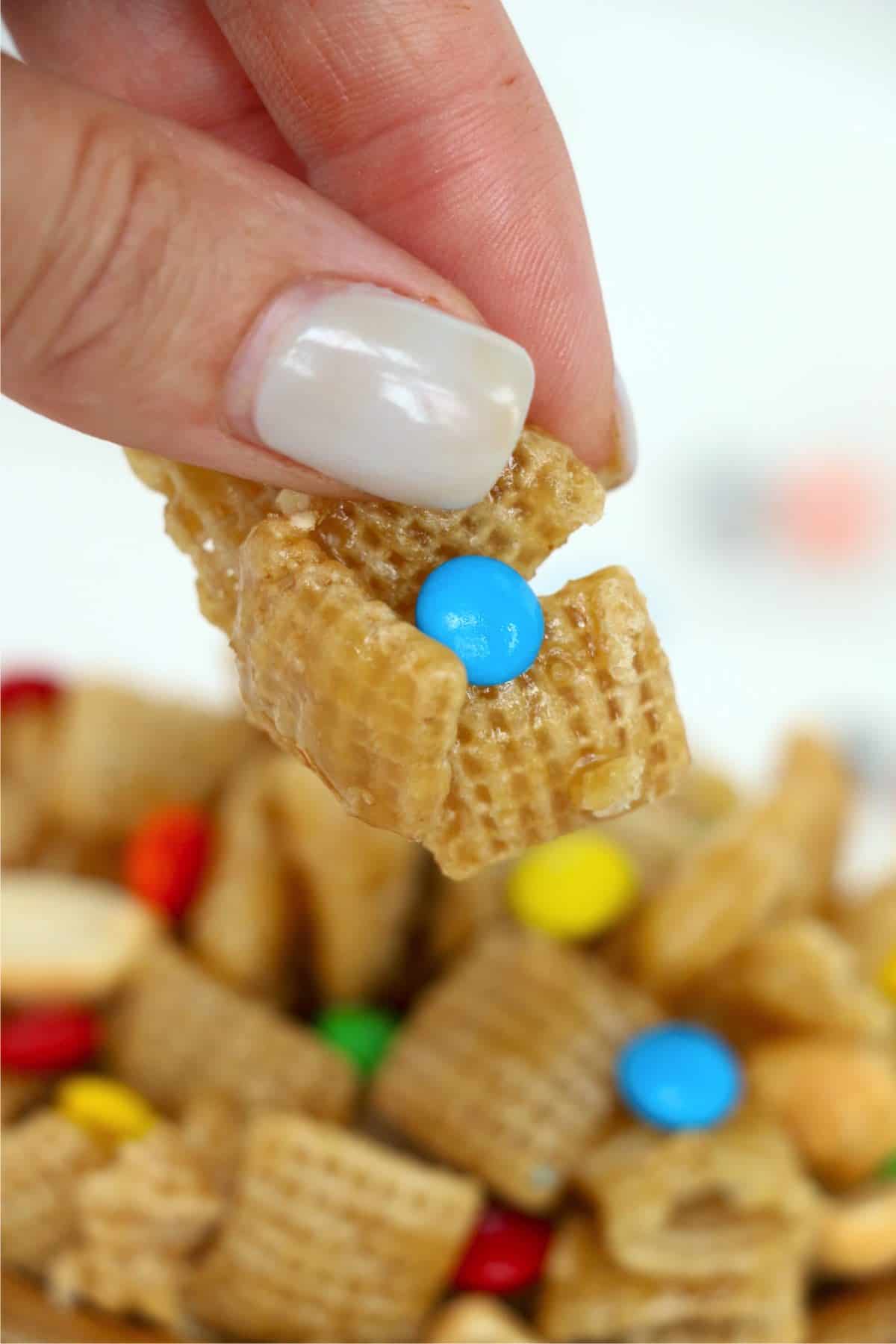 Crispy Chex cereal is coated with a delicious salty and sweet caramel coating and then mixed with candies, peanuts, and more. What could be better than that? Nothing, that's what.