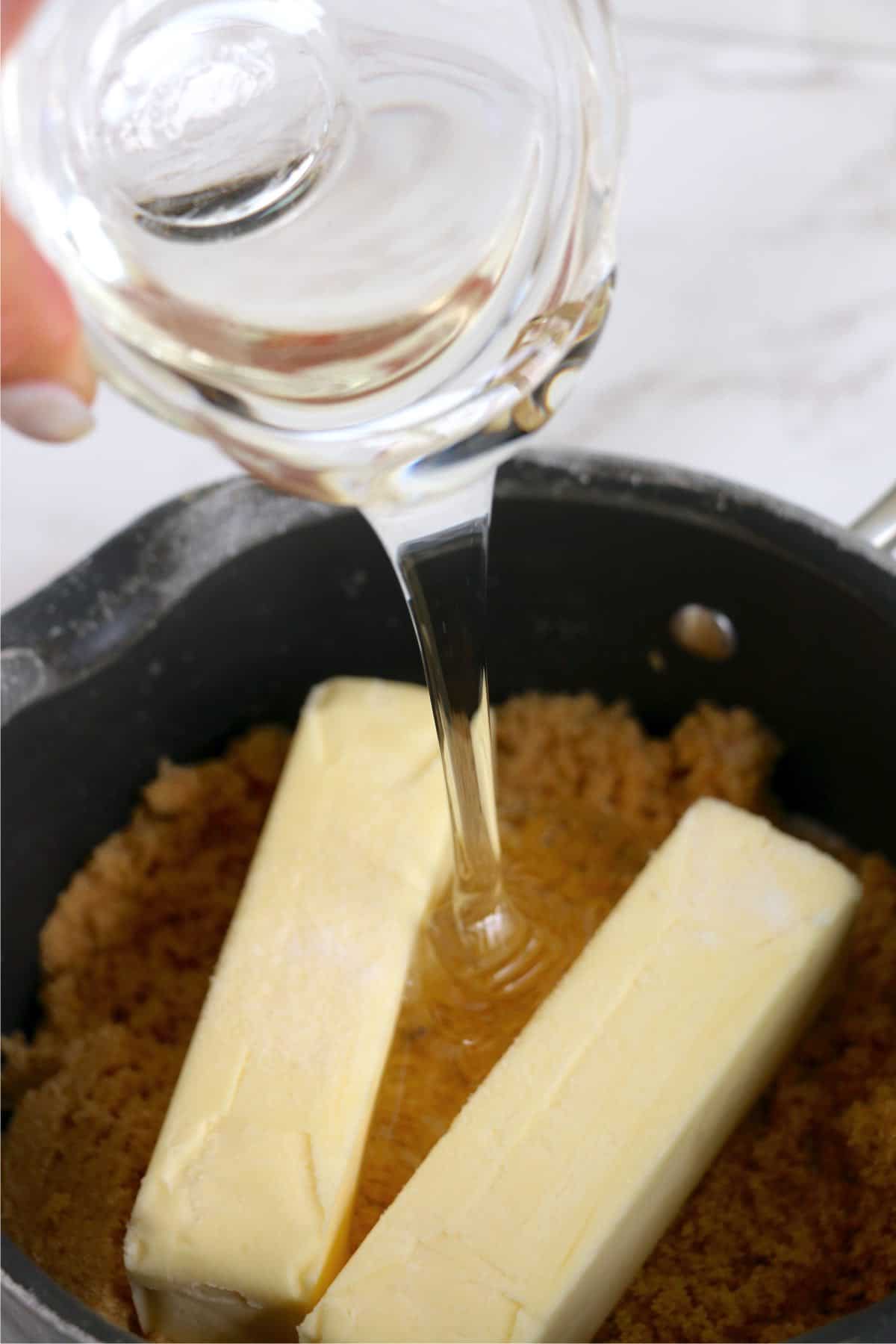 - In a medium saucepan, place corn syrup, salt, brown sugar, and butter over medium heat. Stir often. Allow to boil for about 1 minute.