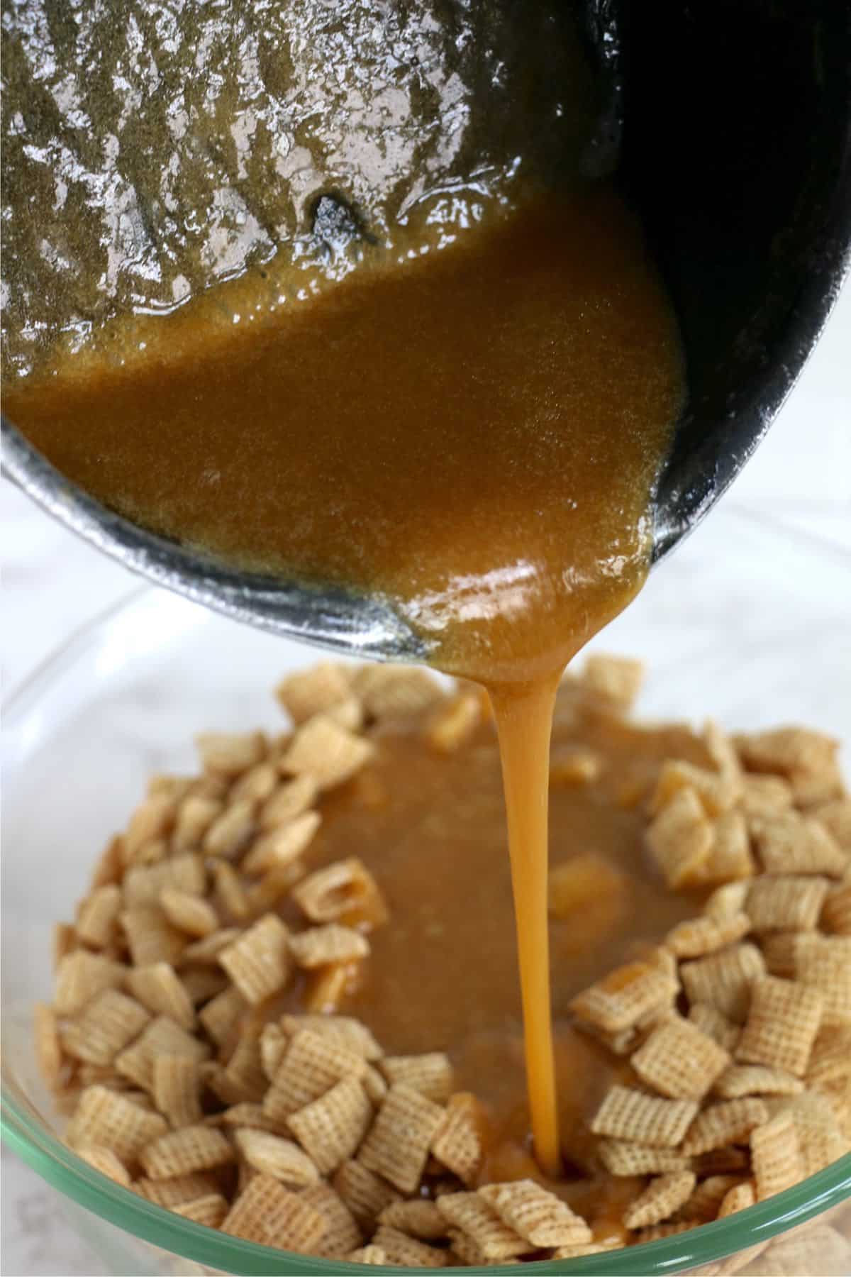Step 5: Pour caramel mixture over top of cereal. Stir until cereal is completely coated.