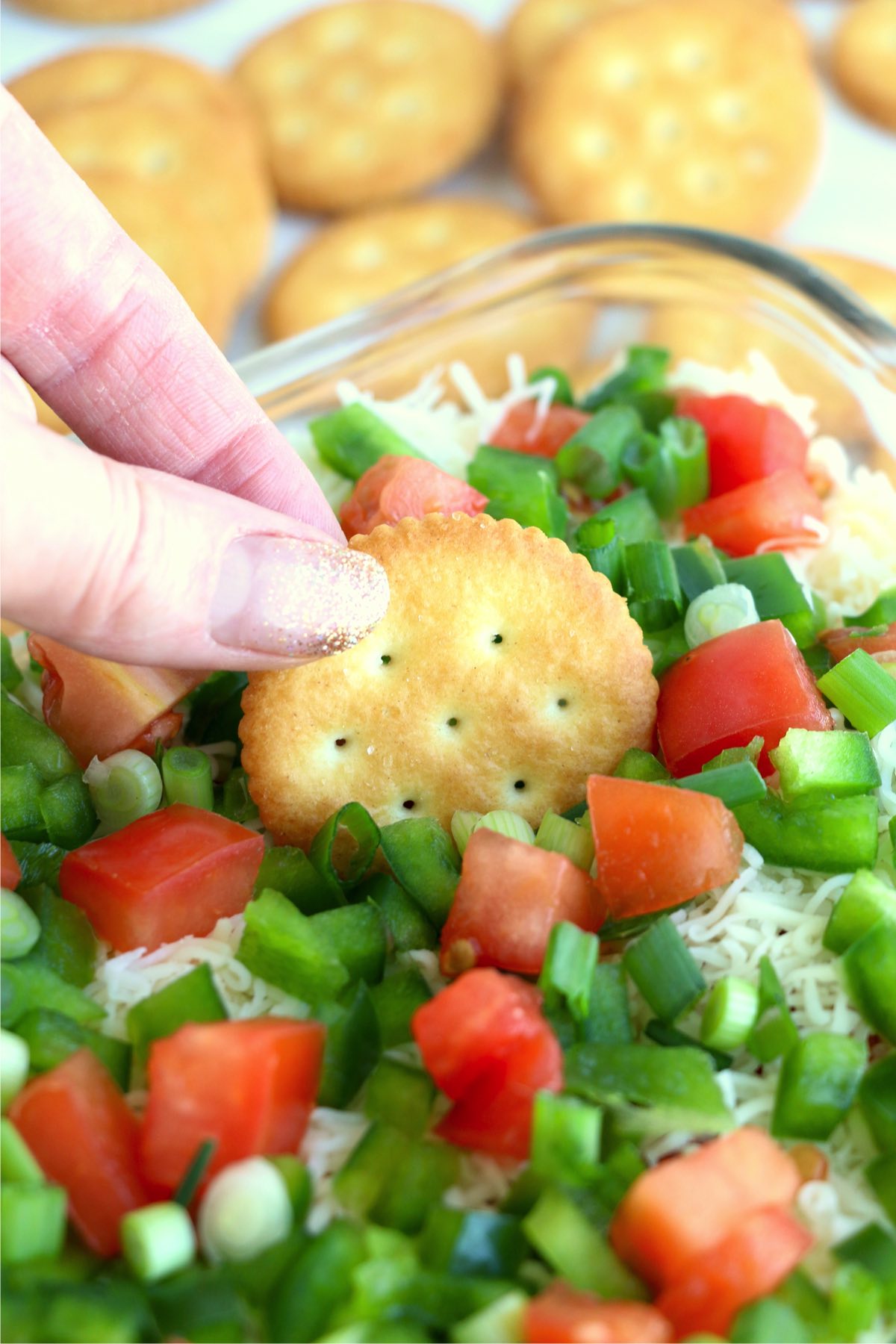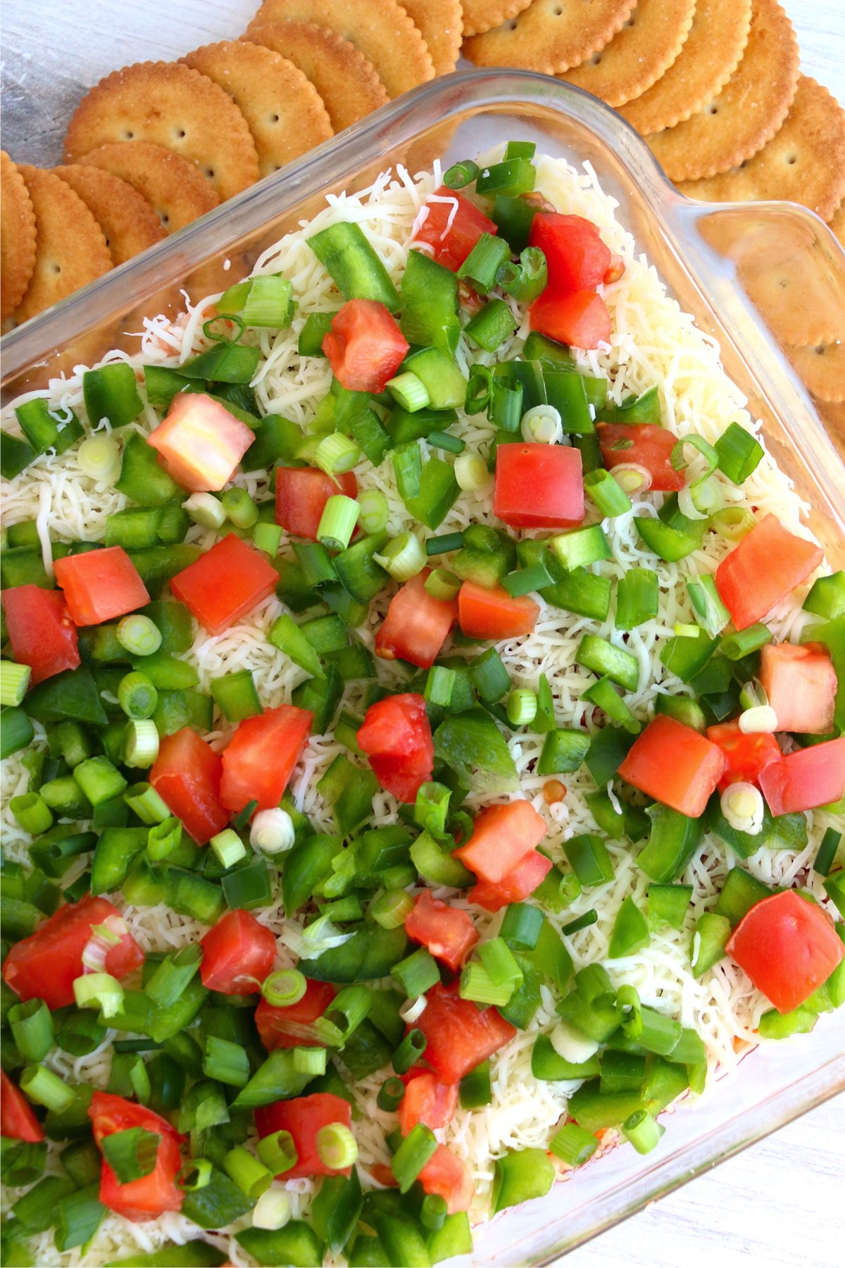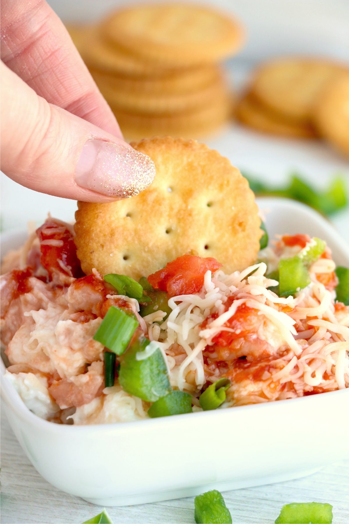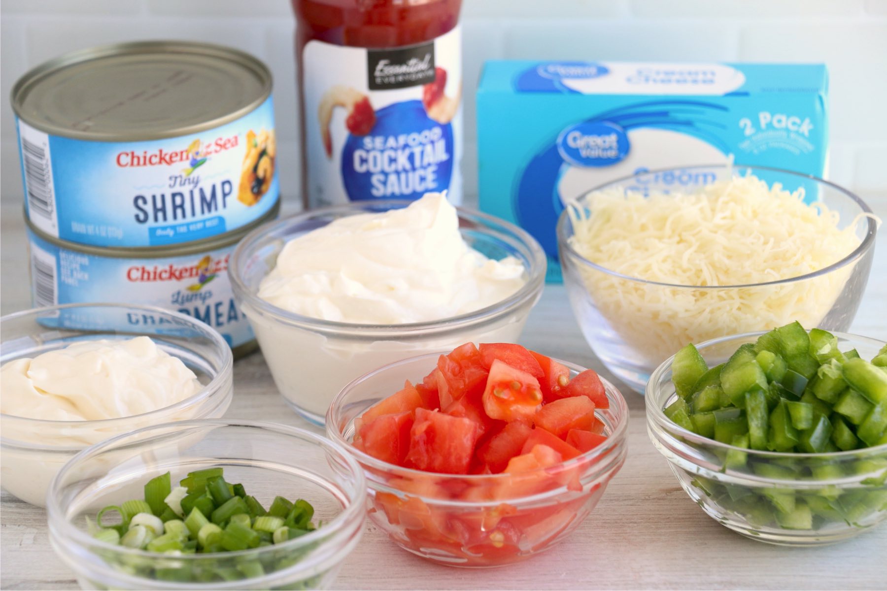 This seafood cheese dip is loaded with a creamy sour cream base, cheese, veggies, crab, and shrimp. It's an explosion of flavor in every bite.