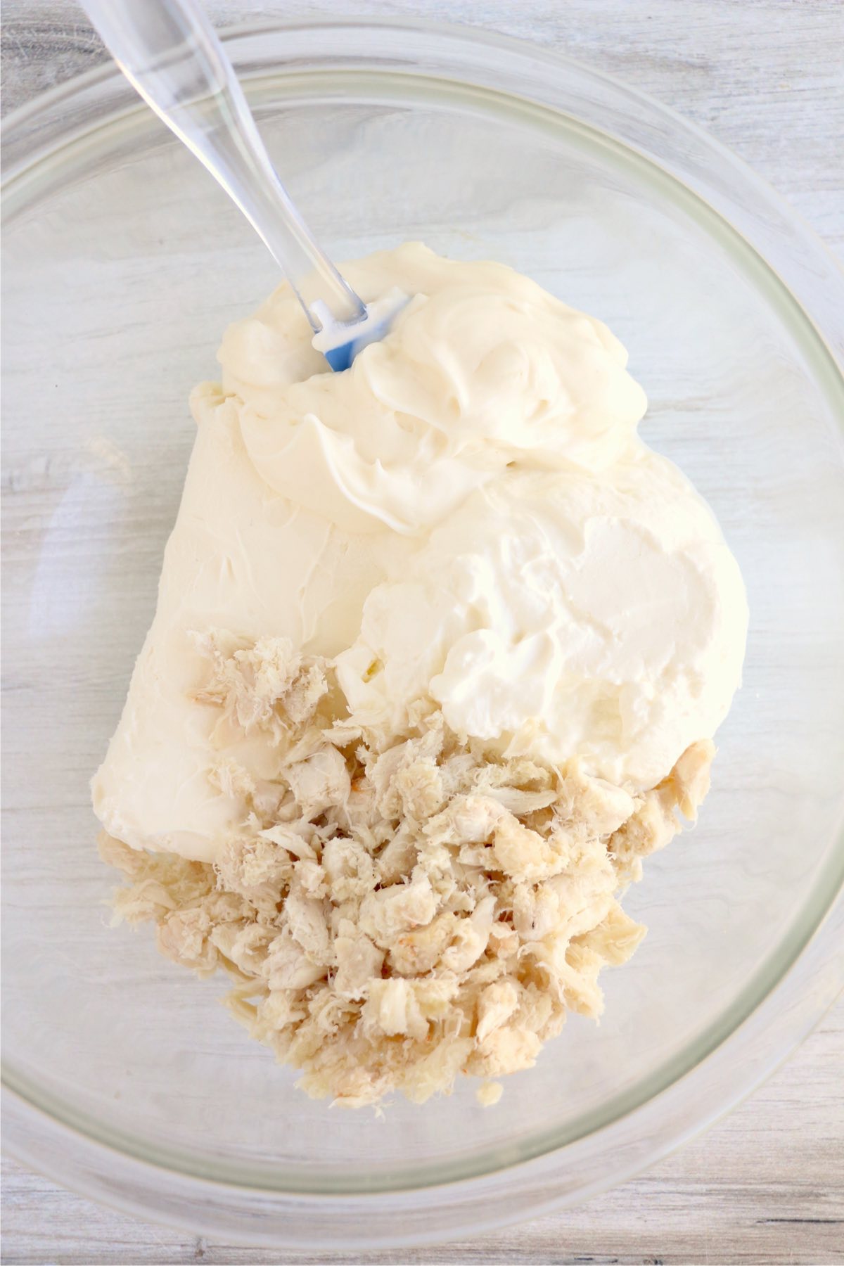 - In a medium mixing bowl, combine cream cheese, sour cream, crab, and mayonnaise using a handheld mixer.