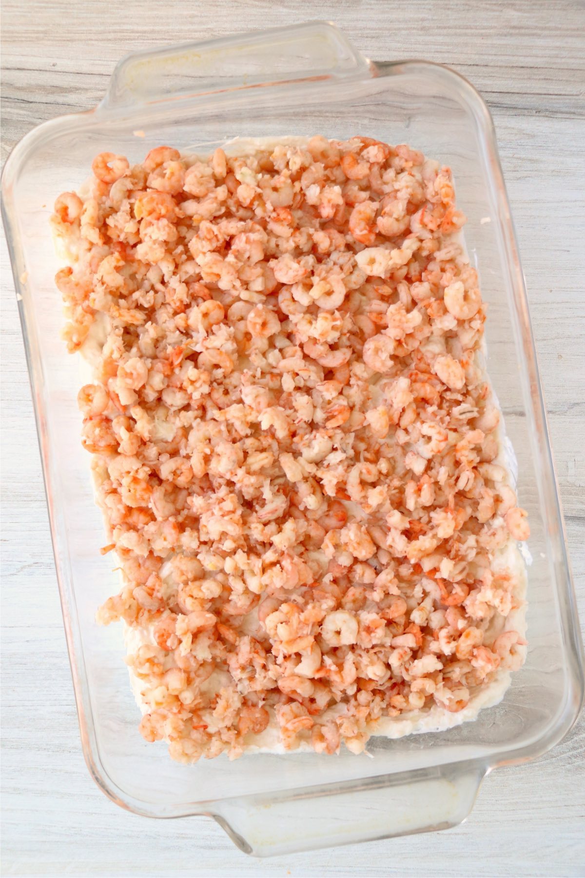 Step 3: Sprinkle shrimp over top of the cream cheese mixture.