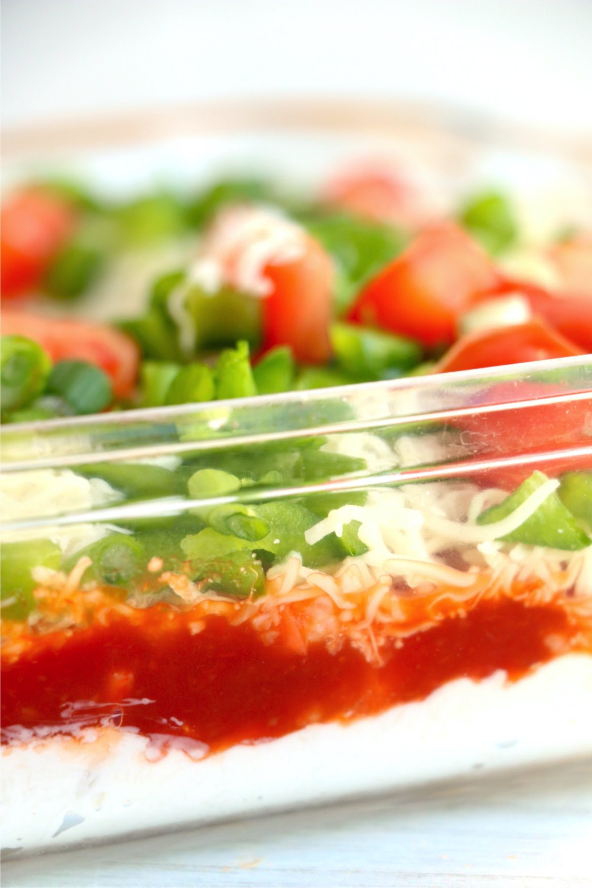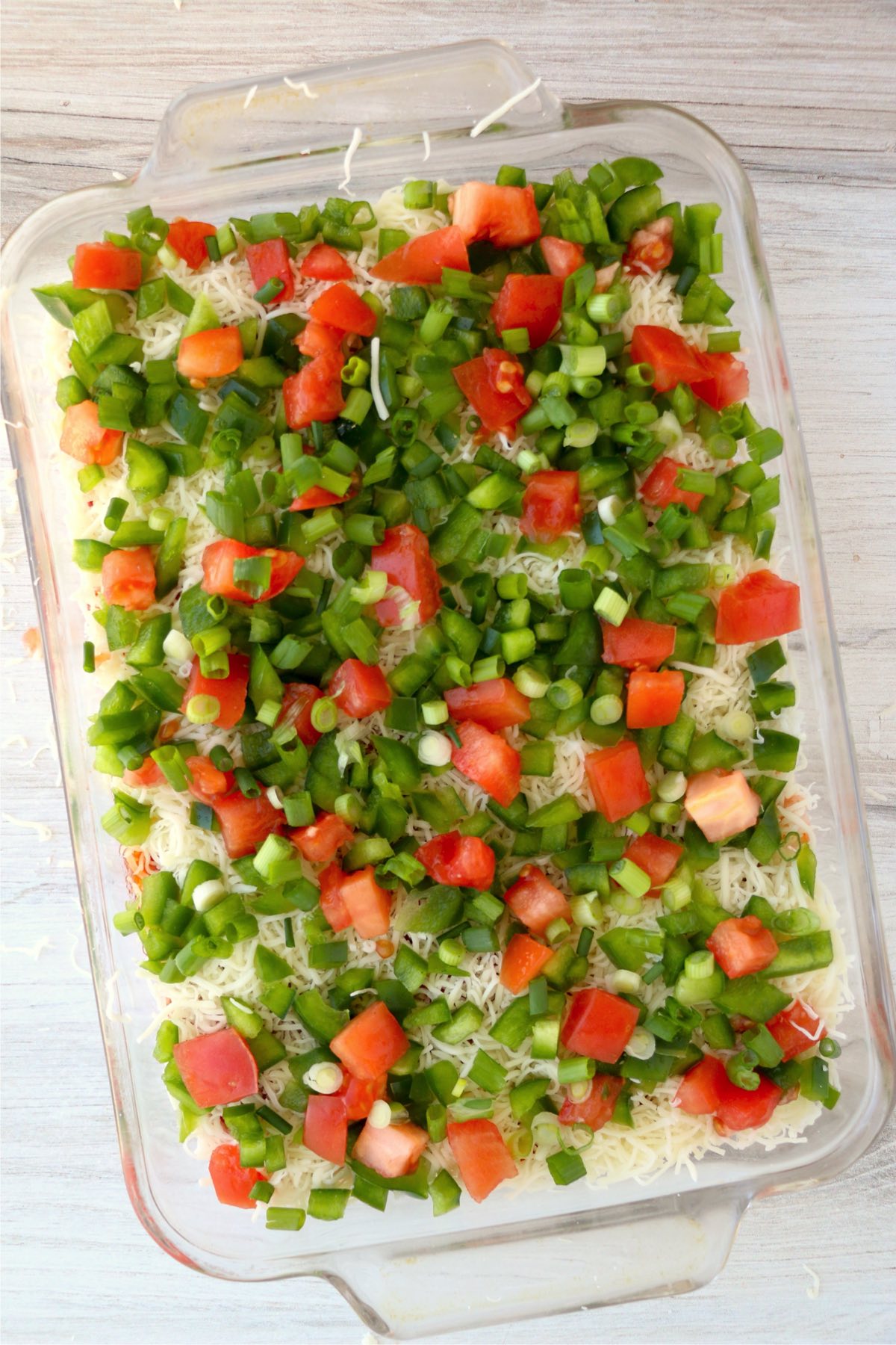 - Continue with seafood sauce, cheese, peppers, onions and tomatoes.