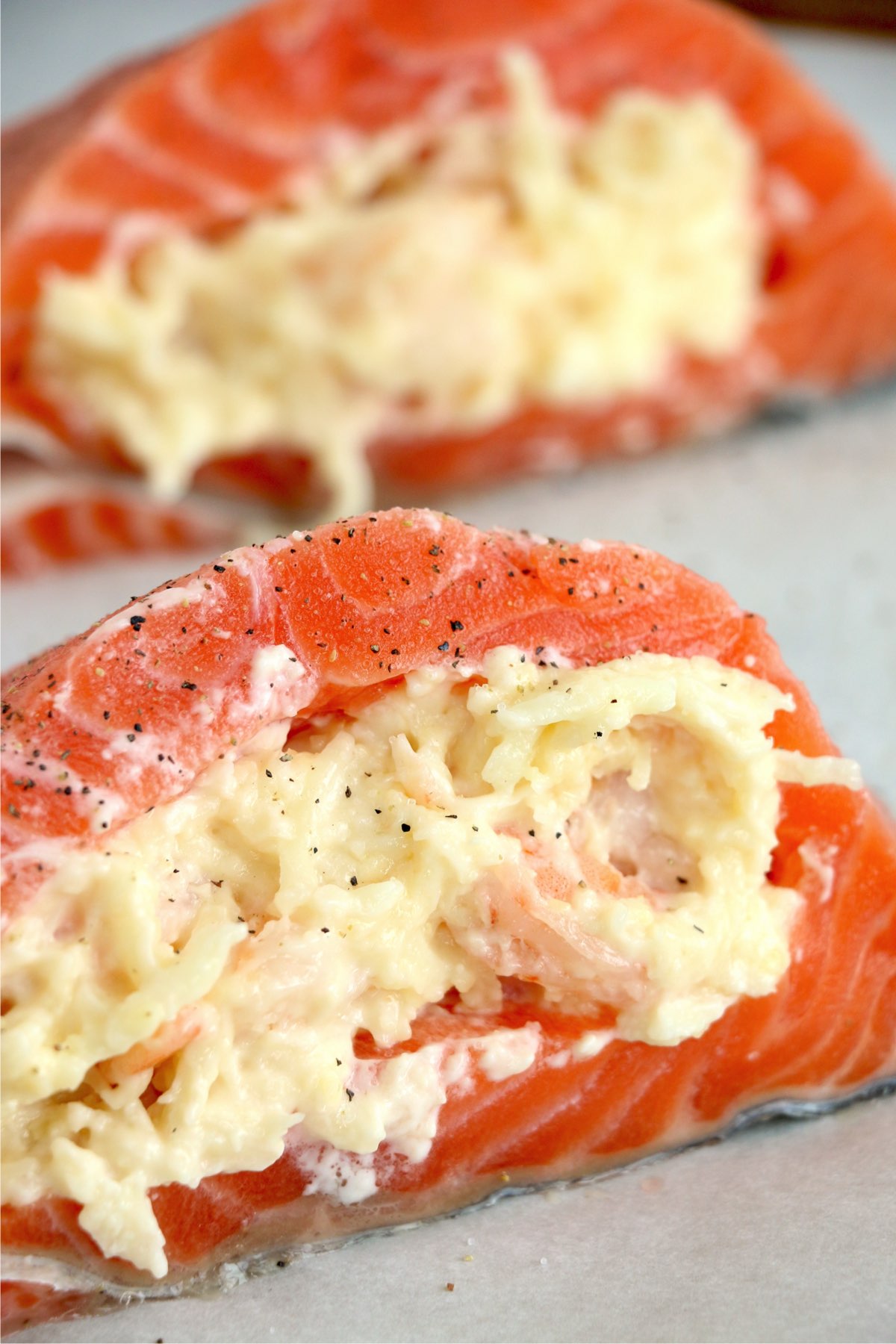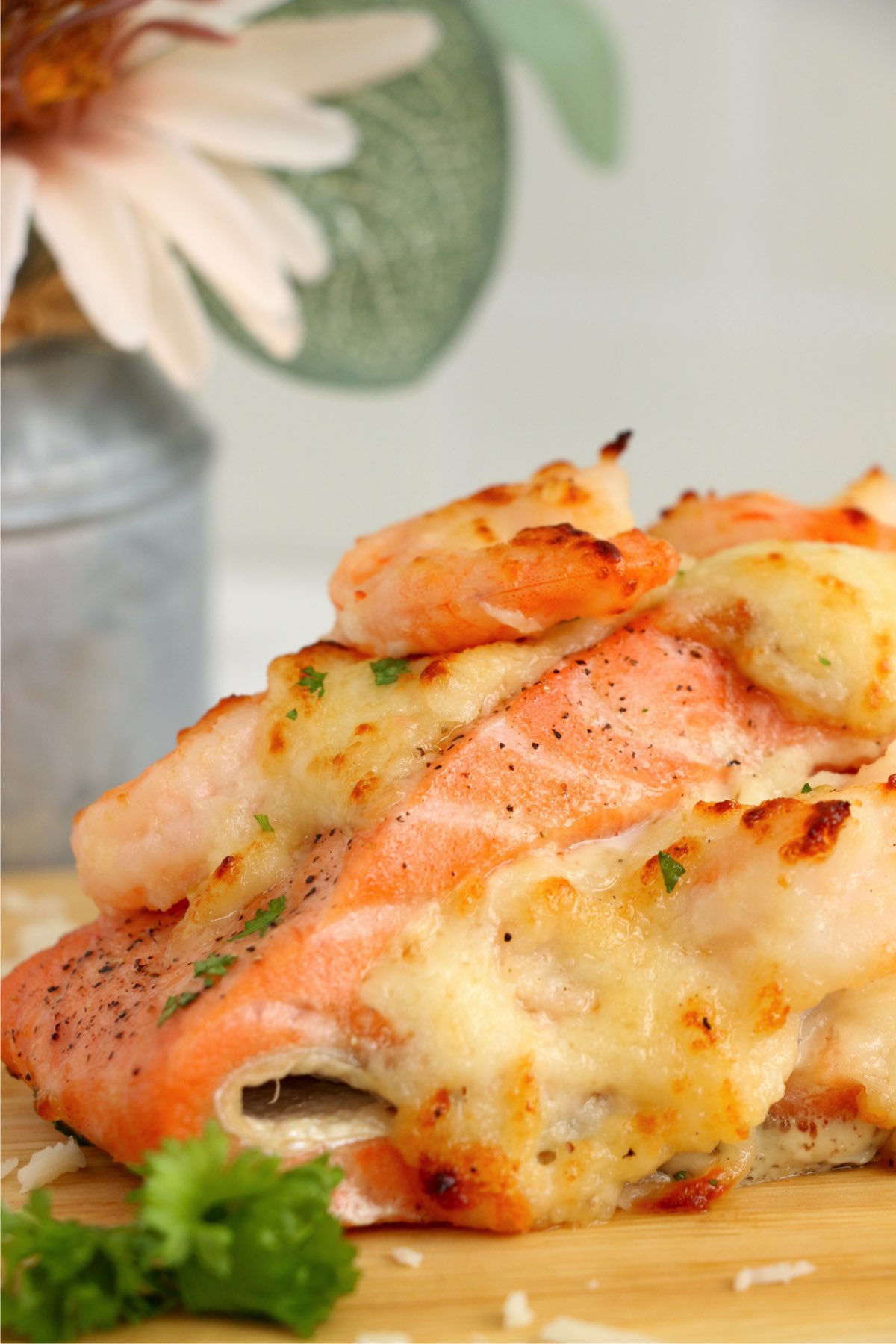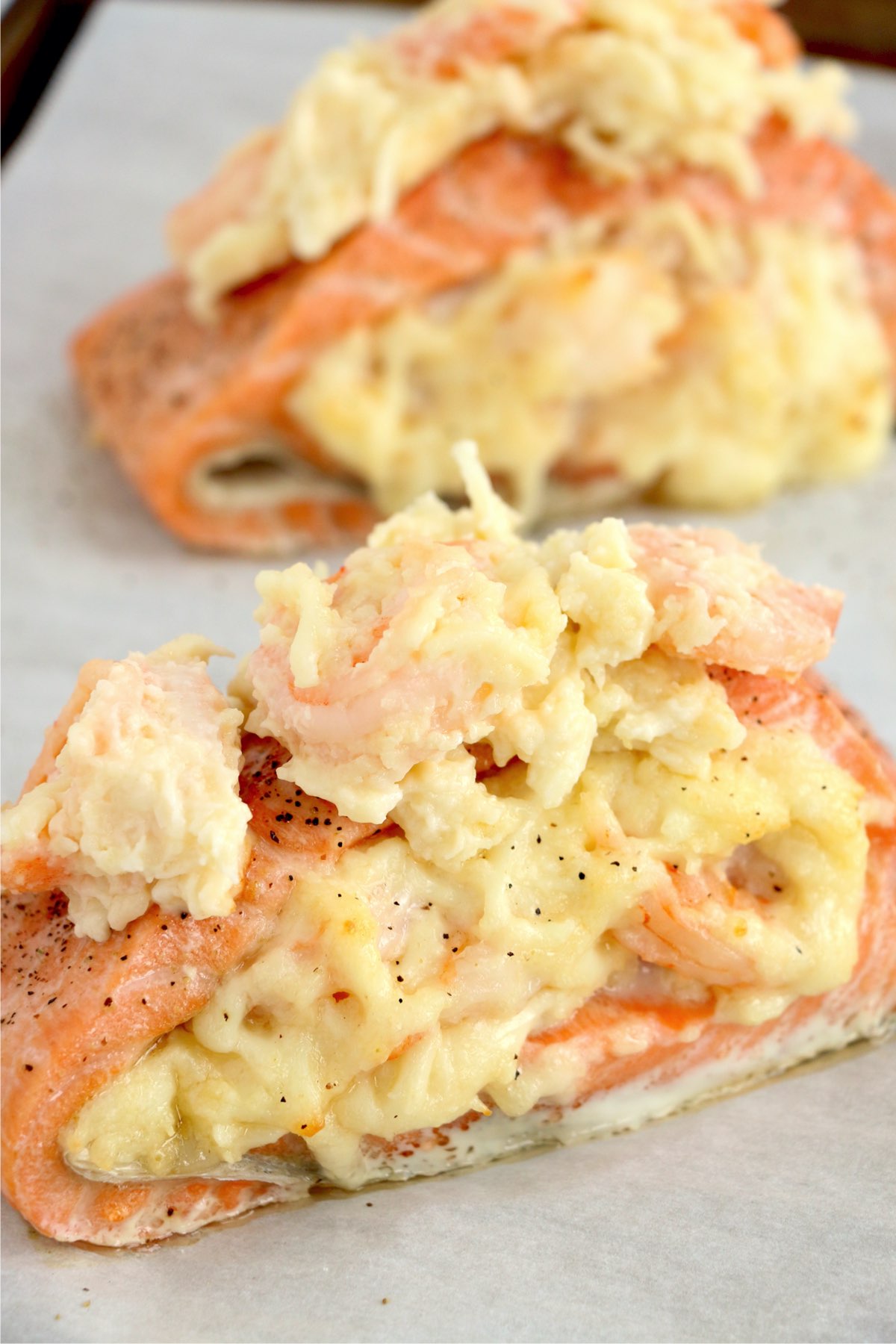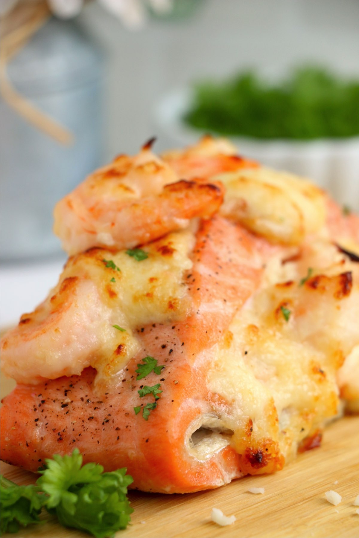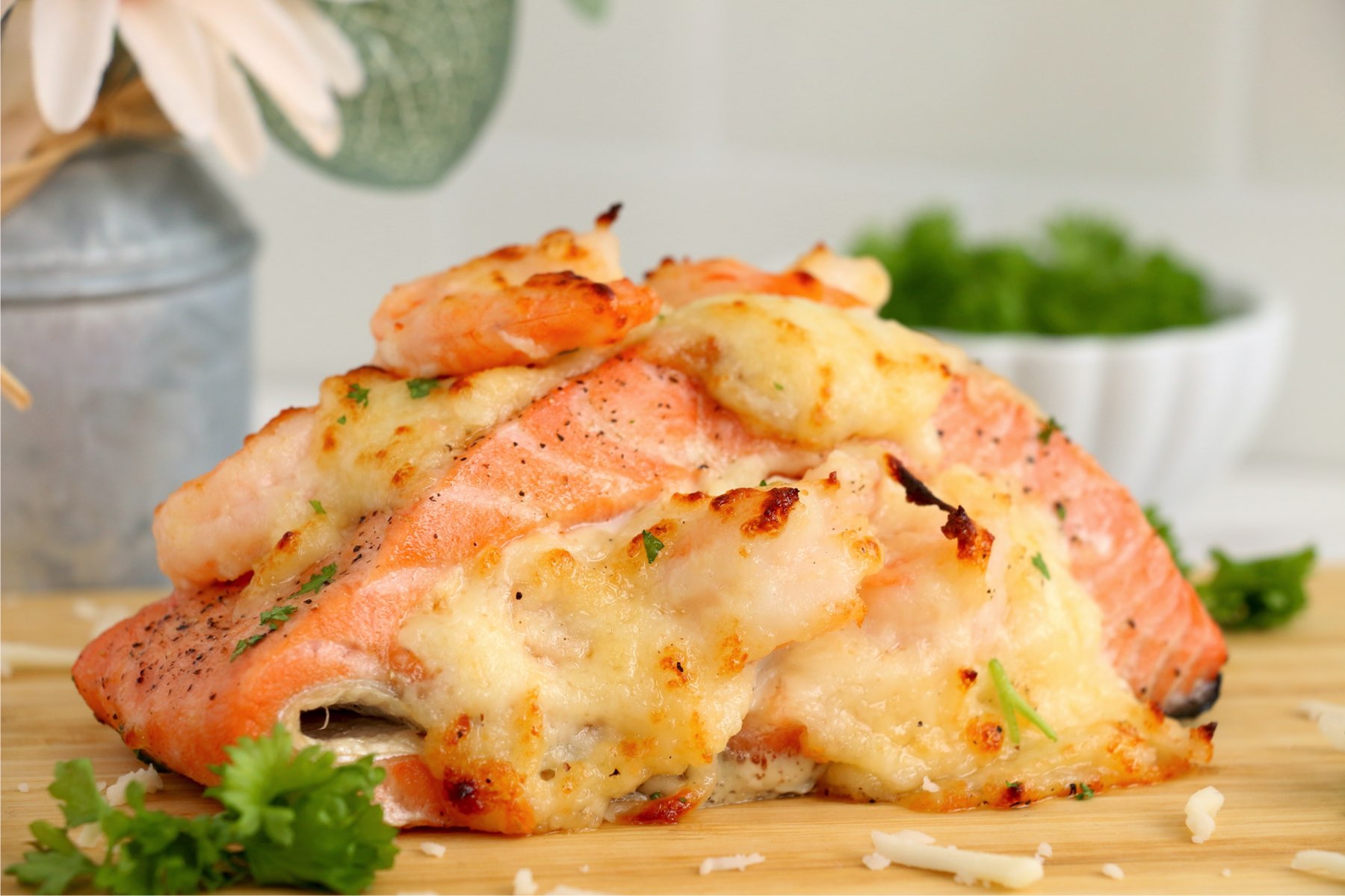 Shrimp stuffed salmon is a feast for any seafood lover. Perfectly cooked salmon is stuffed full of shrimp in a creamy, cheesy sauce and just waiting for you to devour it!