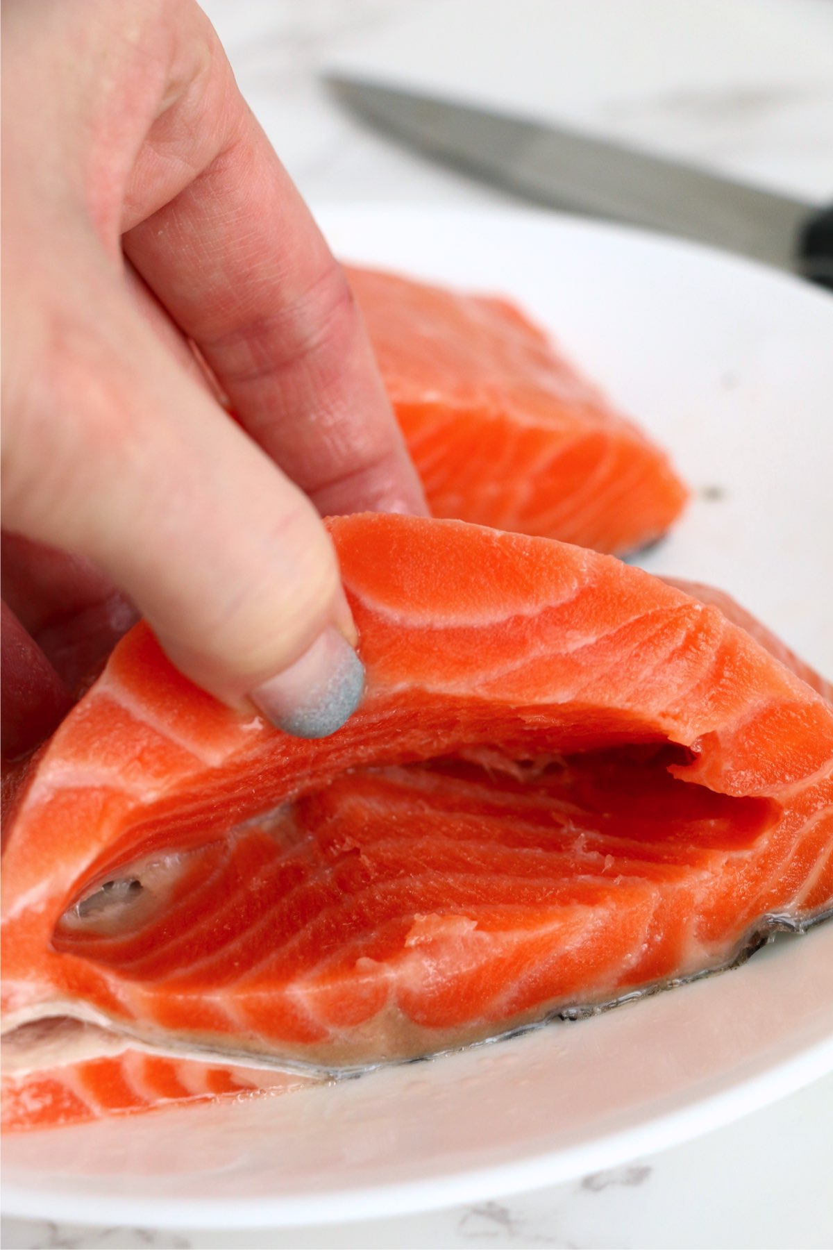 - When cutting your salmon, be sure not to cut all the way through. There should only be a slit on one side.