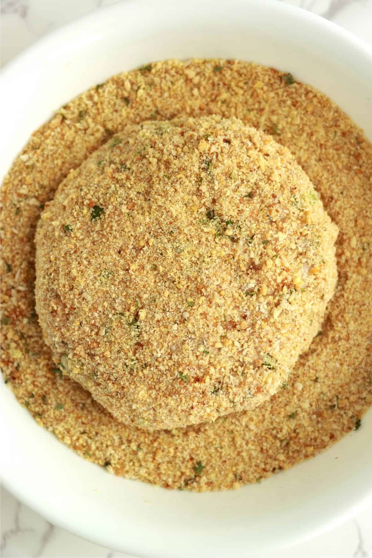 - Coat each patty (top, bottom, and sides) with breadcrumbs.