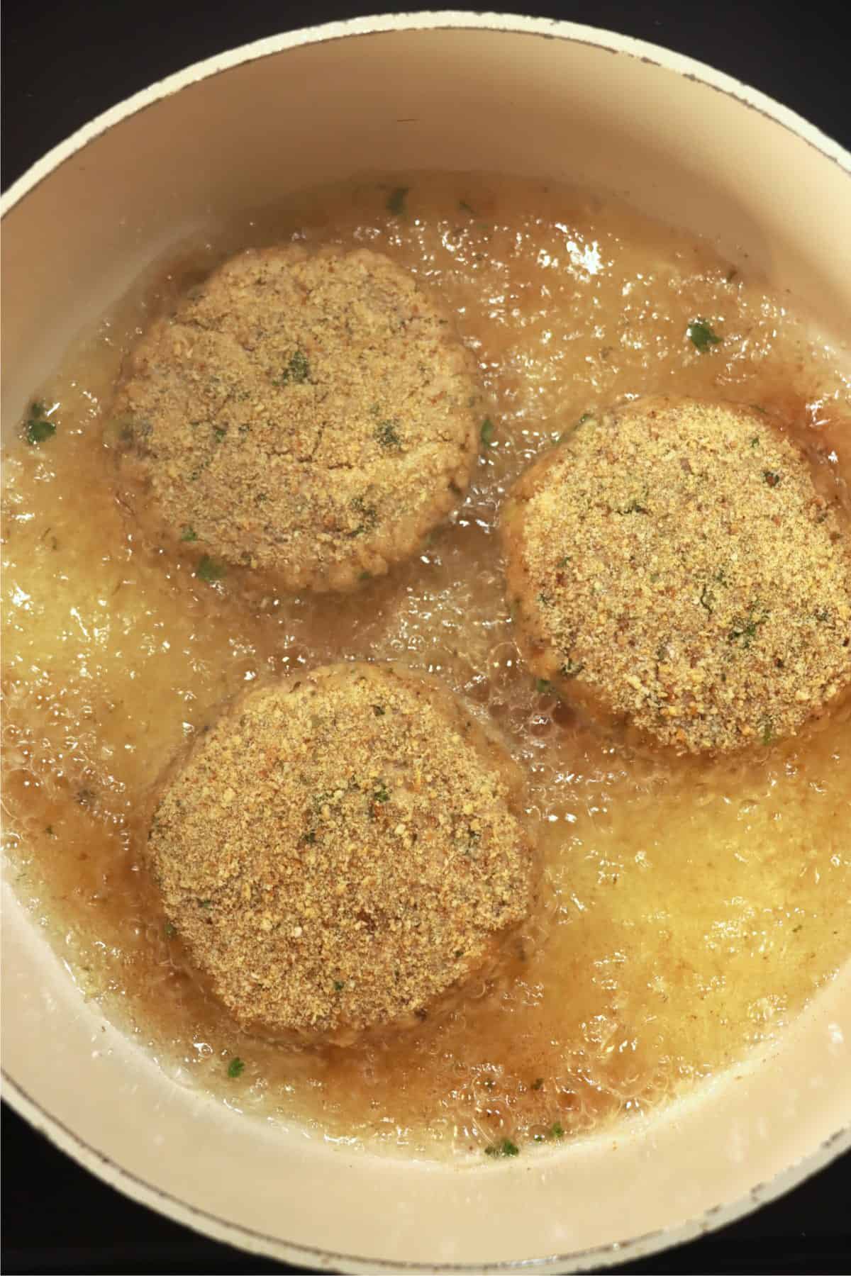 - Place breaded patties into your heated oil. Cook for 3 minutes on each side or until patties are golden brown. Be sure to check your patties while cooking to be sure they do not burn.