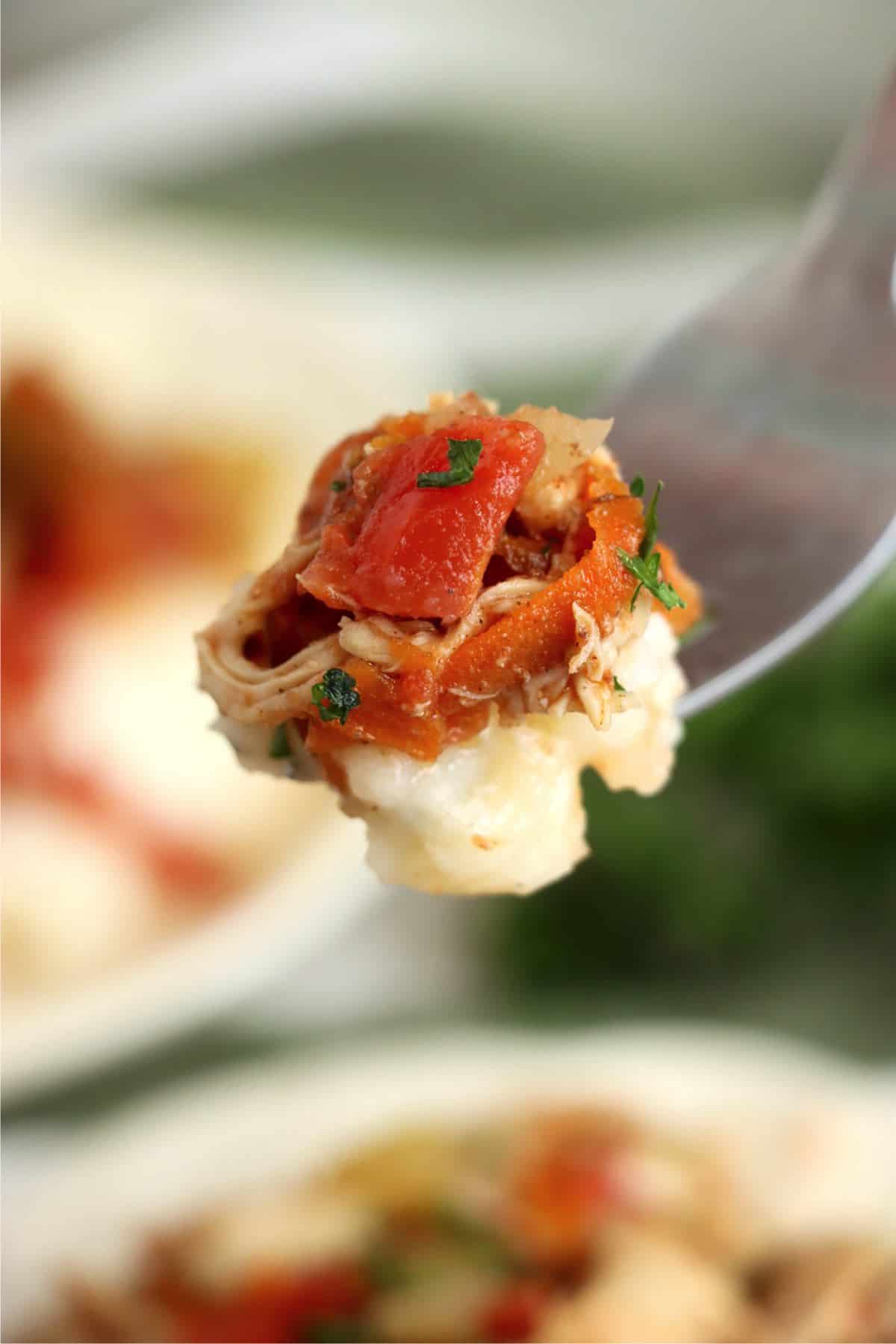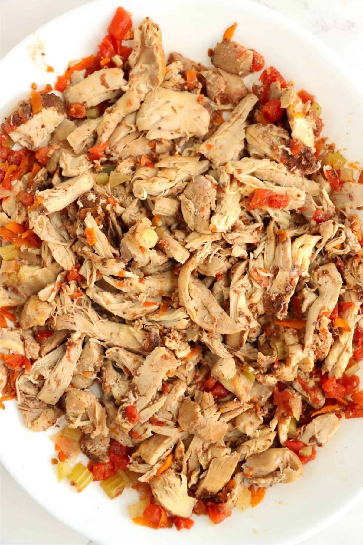 4: Stir the chicken back into the veggie mixture in the slow cooker. Enjoy!