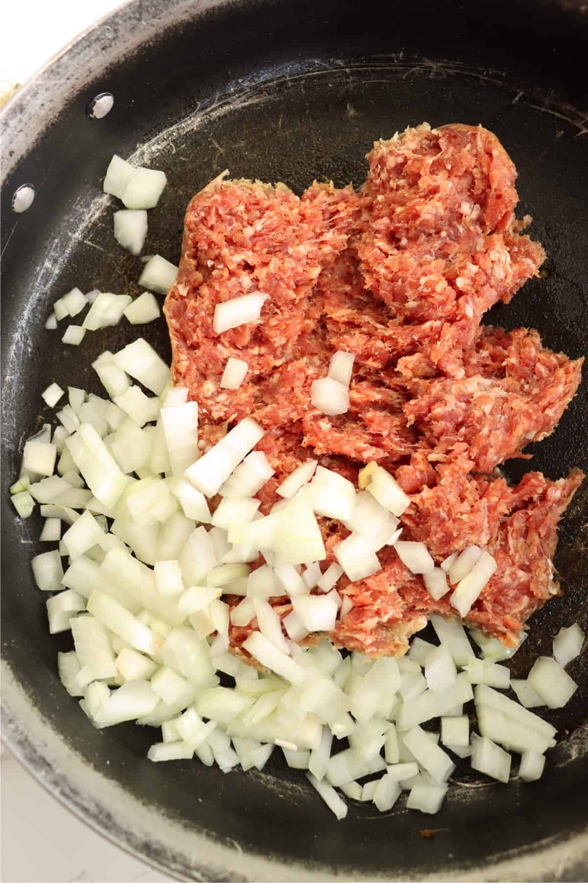 - In a large skillet, add onions and ground beef. Brown meat until no longer pink and onions are tender. Drain if necessary.