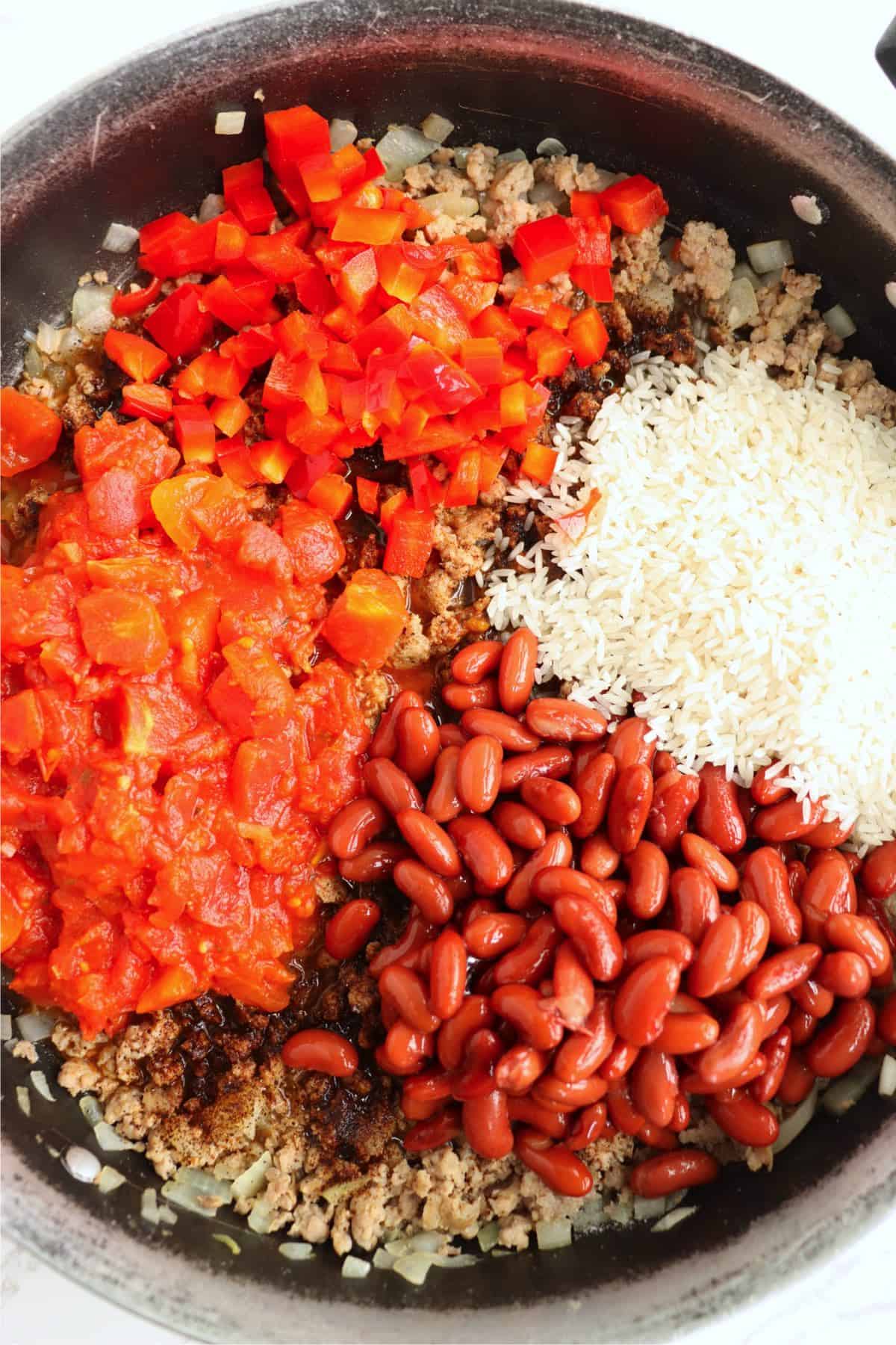 - Add tomatoes, beans, uncooked rice, water, and chopped peppers.