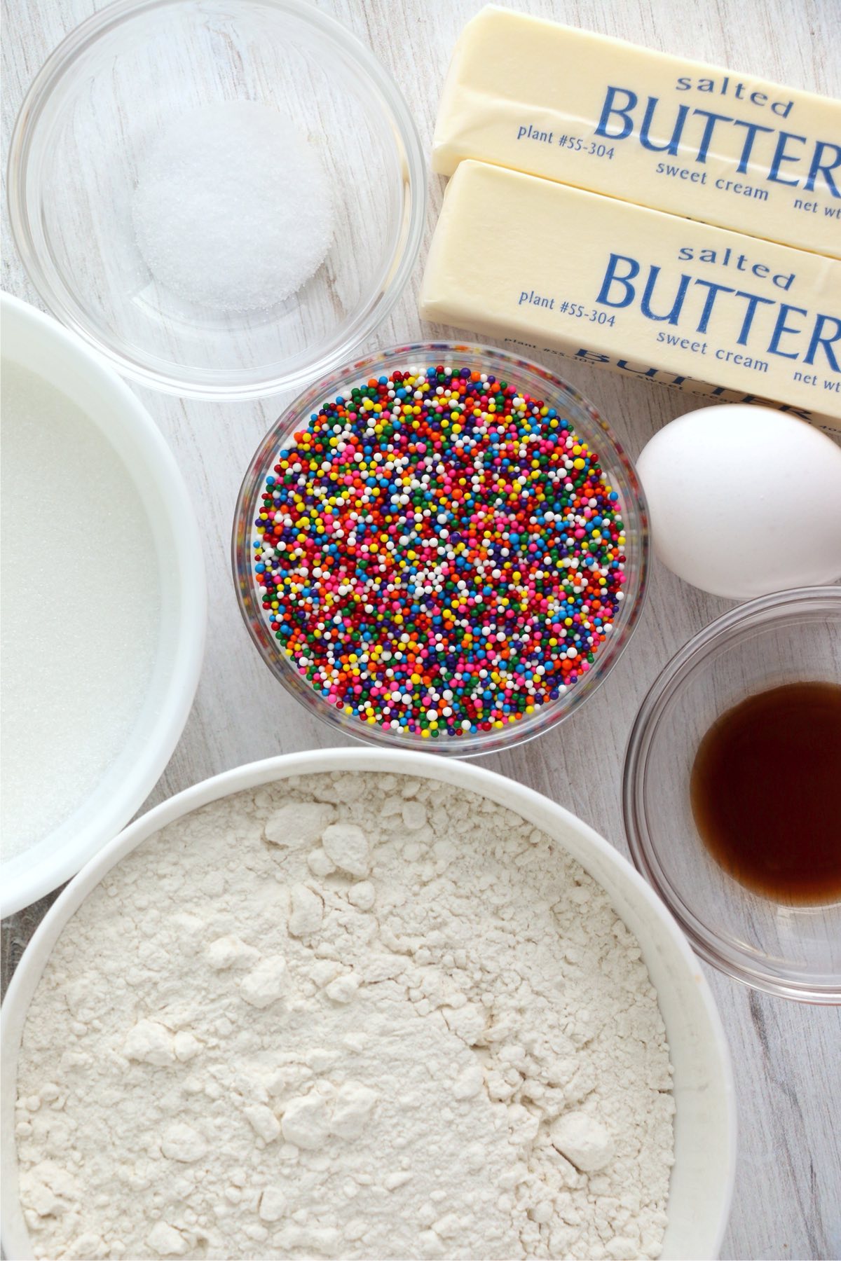 You'll only need basic baking ingredients to make this recipe. Chances are they're all in your kitchen right now, maybe even the sprinkles. The main ingredients are listed here, but you'll find the complete list of ingredients along with amounts in the recipe card at the end of the post.