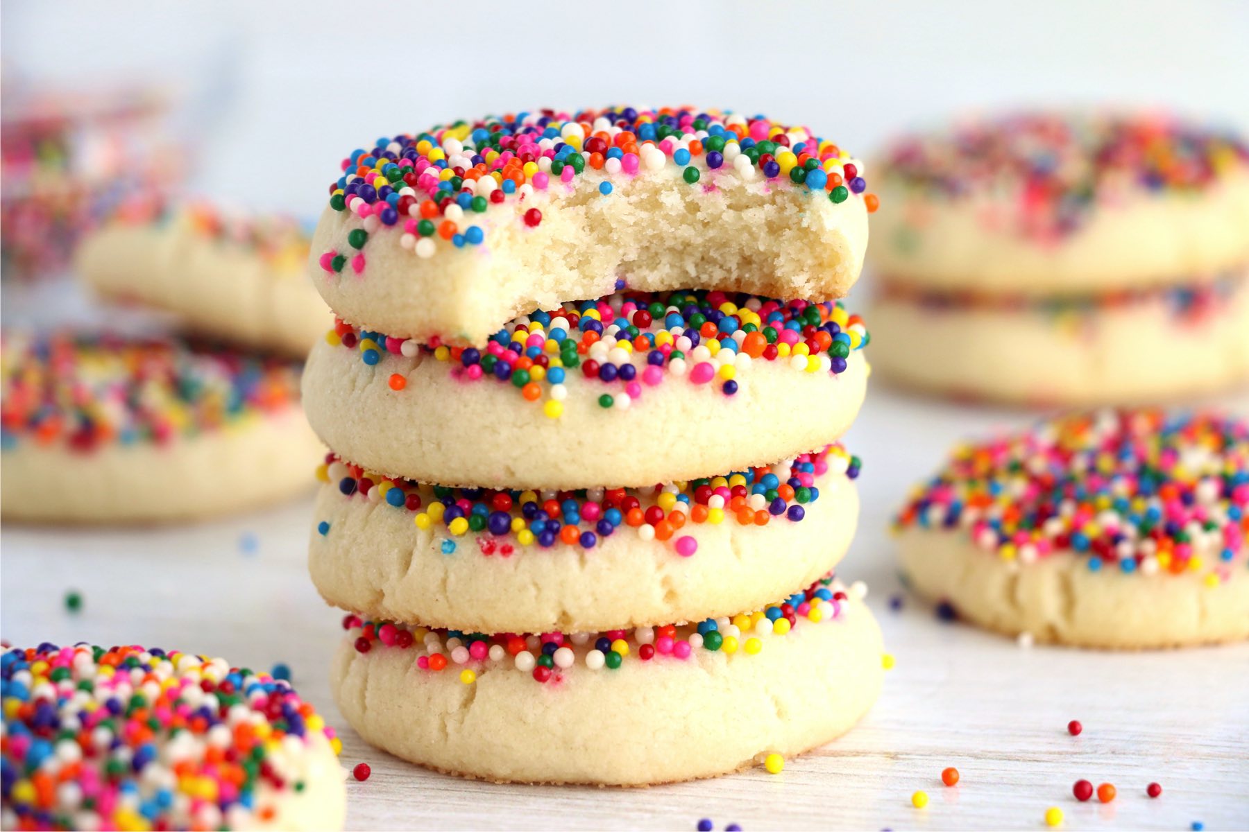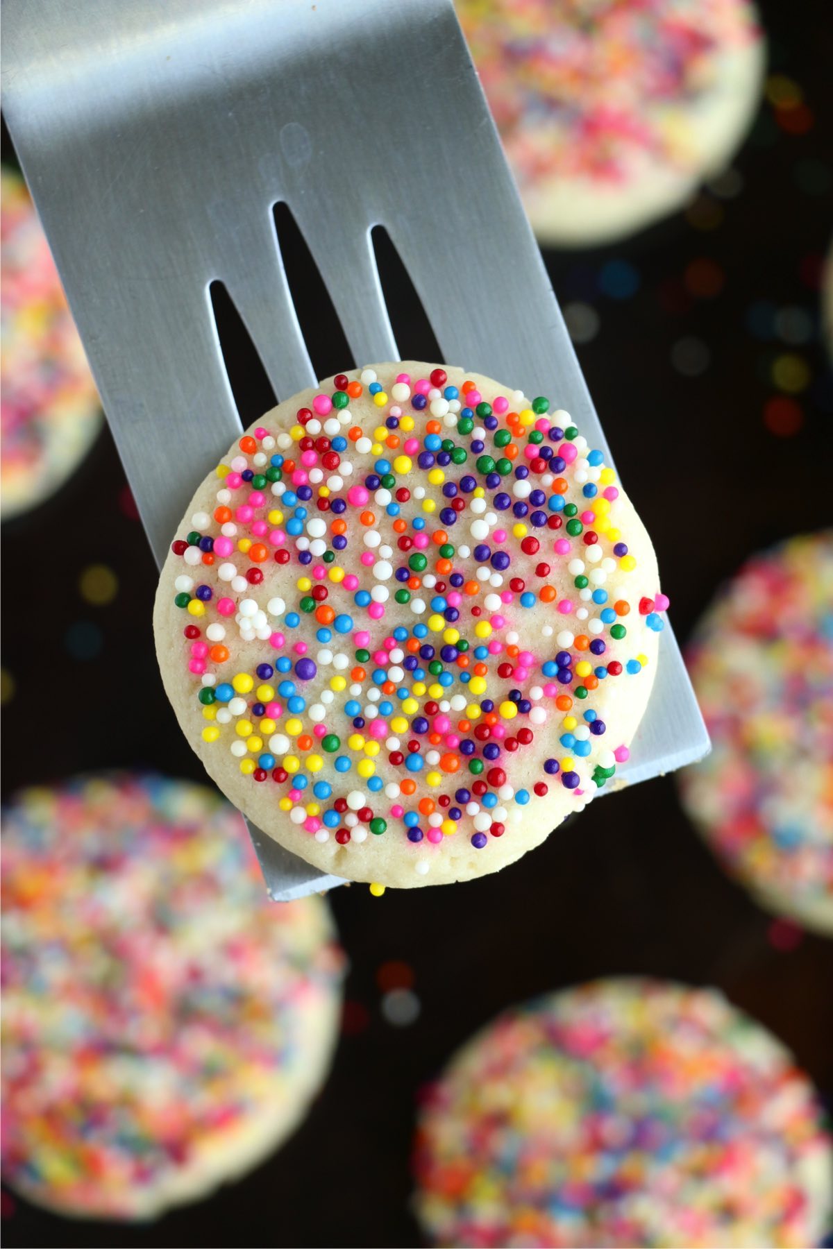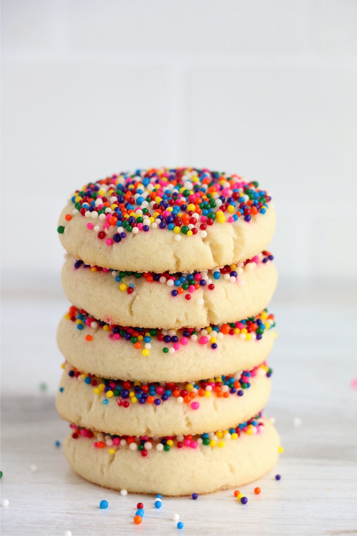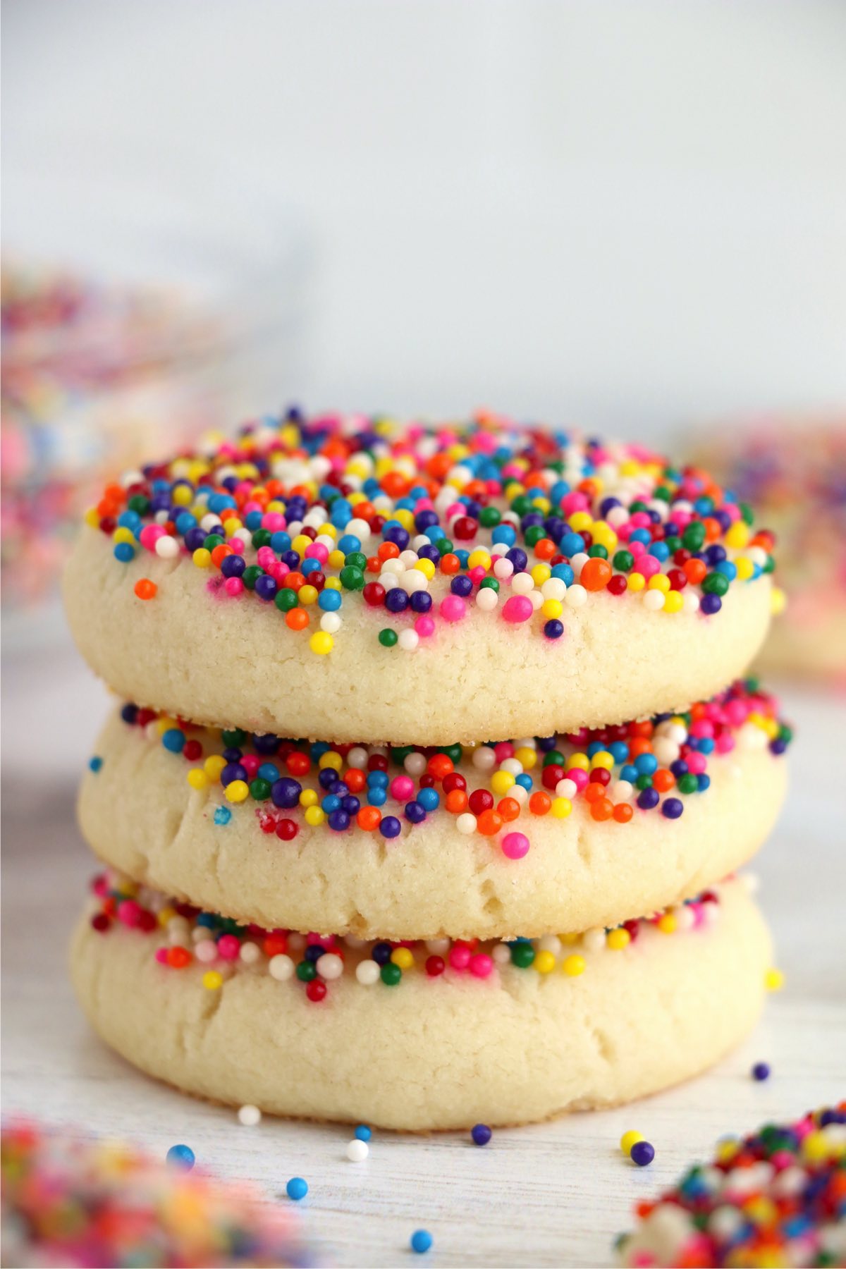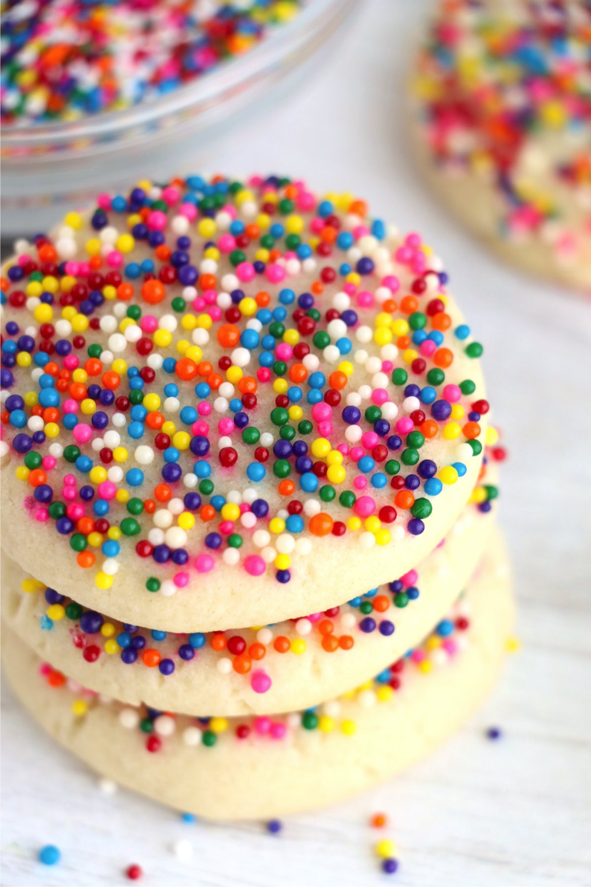 These sprinkle sugar cookies are soft and fluffy. They're topped with fun sprinkles, making them a great cookie for Easter or any occasion.