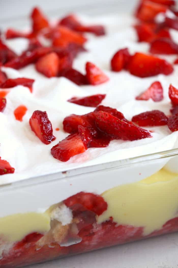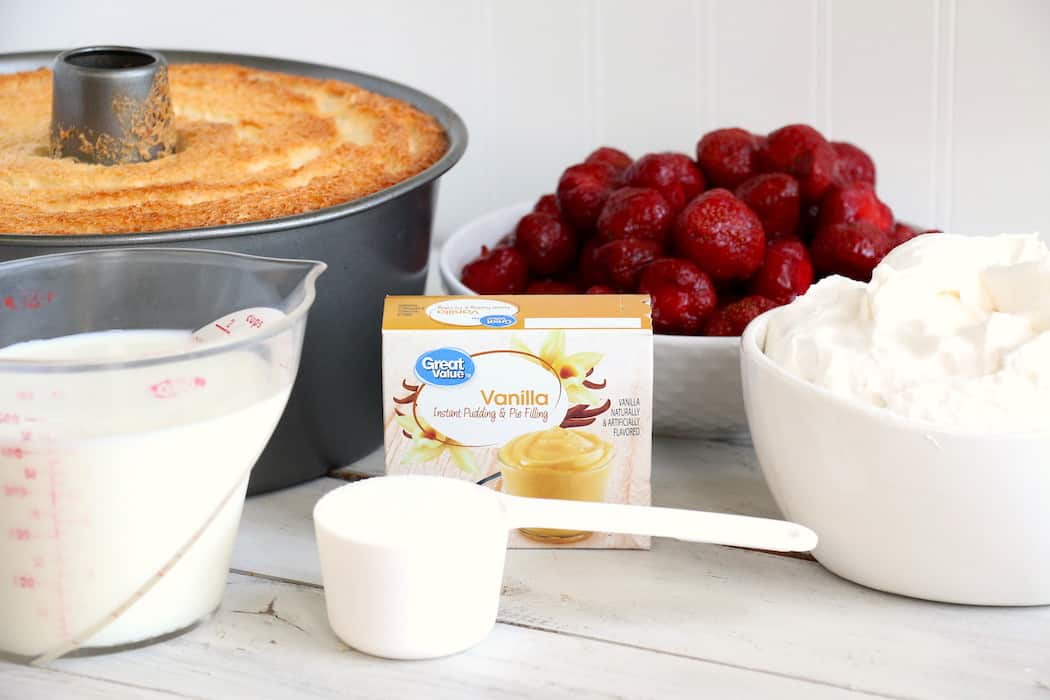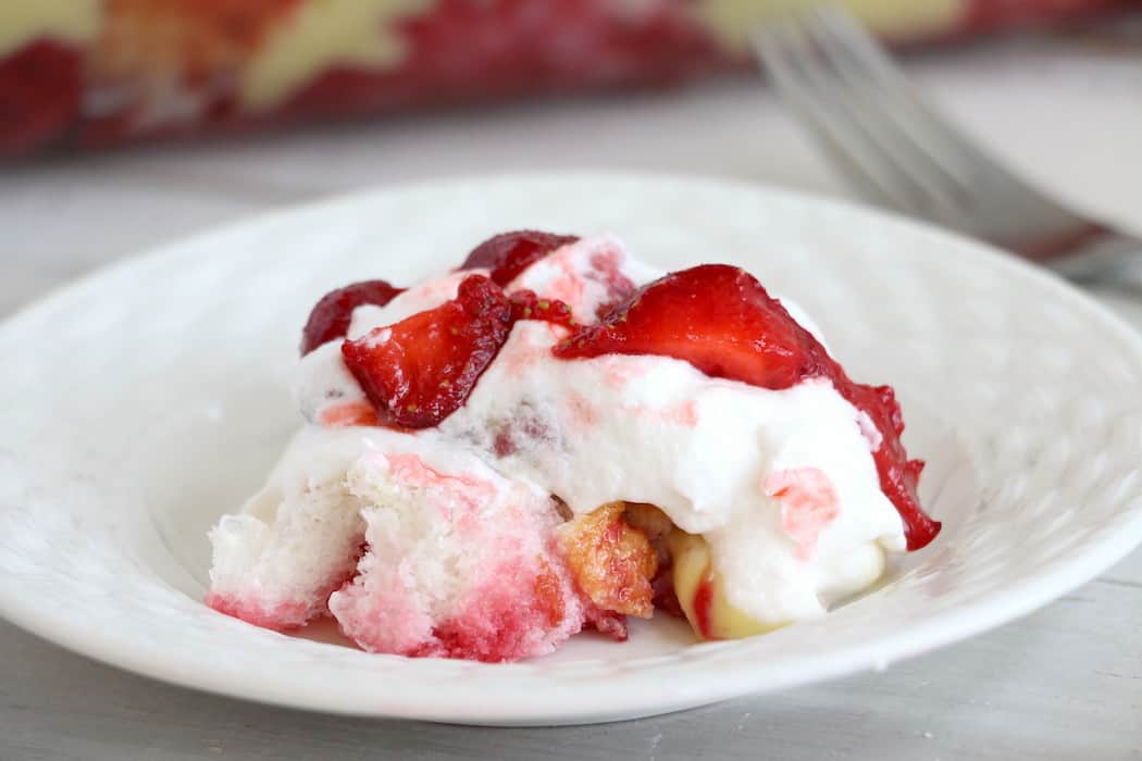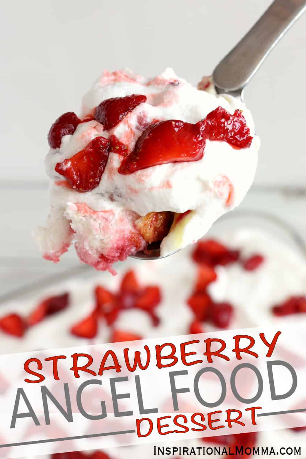 Strawberry Angel Food Dessert comes together quickly and is filled with a perfect combination of flavors. A great choice for your next party! #InspirationalMomma #StrawberryAngelFoodDessert #angelfood #strawberrydessert #strawberry #dessert #desserts #recipe