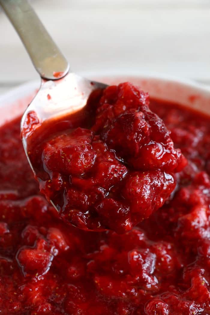 In a separate bowl, combine 2 cups of sliced strawberries and sugar. Mash the strawberries well and mixed to combine. This will create a runny strawberry syrup, which is perfect!