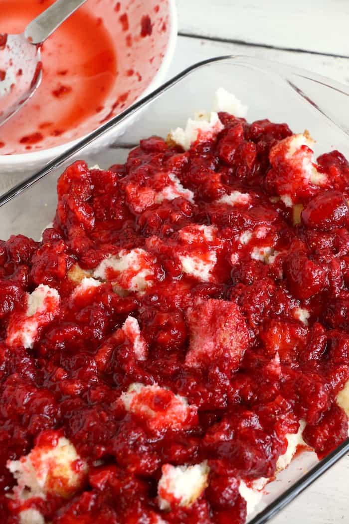Our first layer is made with delicious angel food cake. Usually I make mine out of the box, but if I am short on time, there is no shame in buying a baked cake from the store. Just tear your angel food cake into small pieces and place them in a 9x13 baking dish.