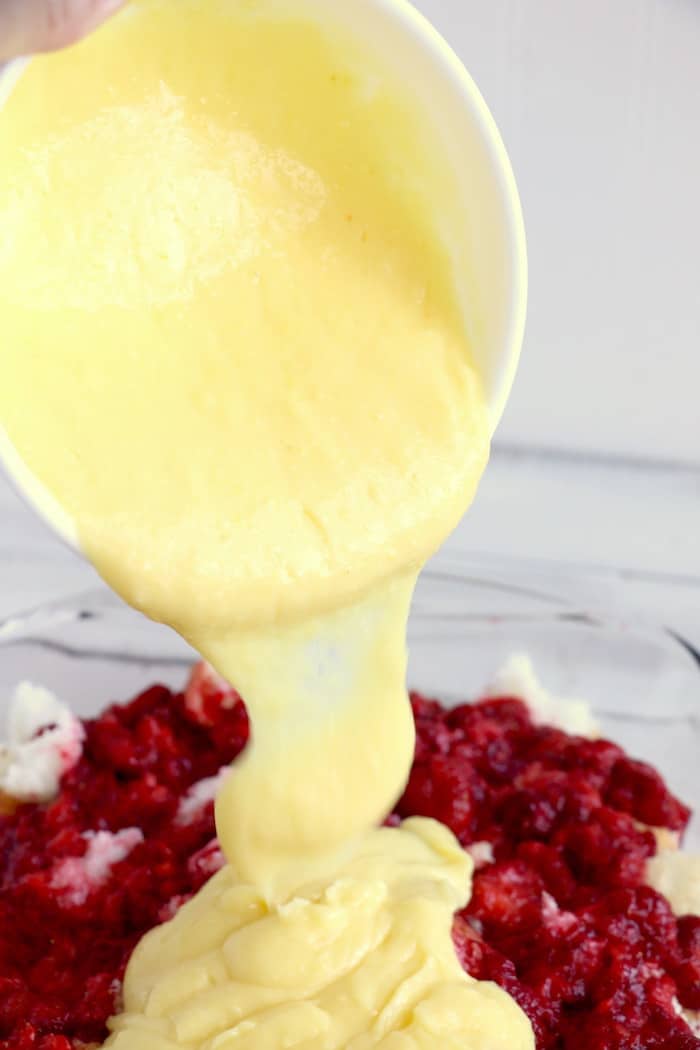 Next up is the pudding! Evenly spread it on top of the strawberries.
