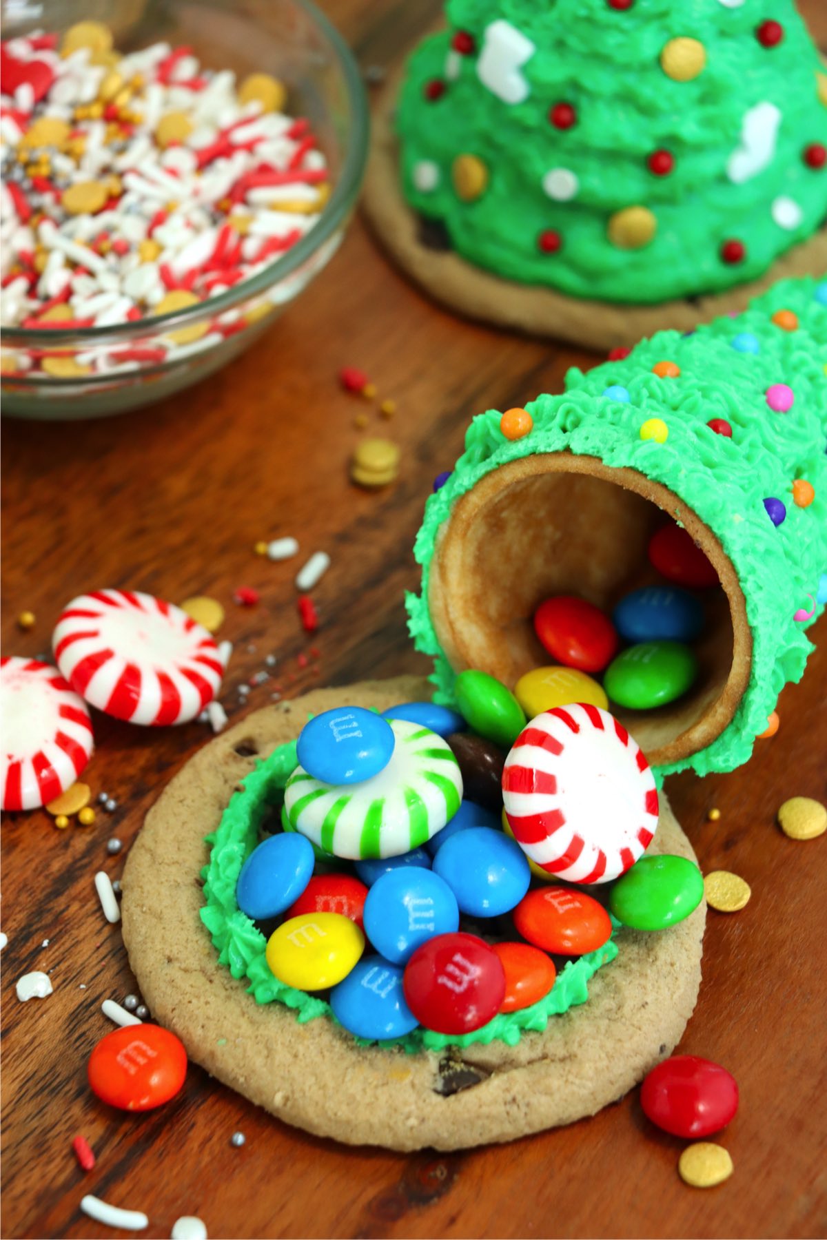The thing I love about these trees so much is just how festive they are. I mean, they tick all the boxes. The frosting and sprinkles make them look just like Christmas trees. They sit on a chocolate chip cookie base (always a classic). Of course, they're also filled with candies that are perfect for the season!